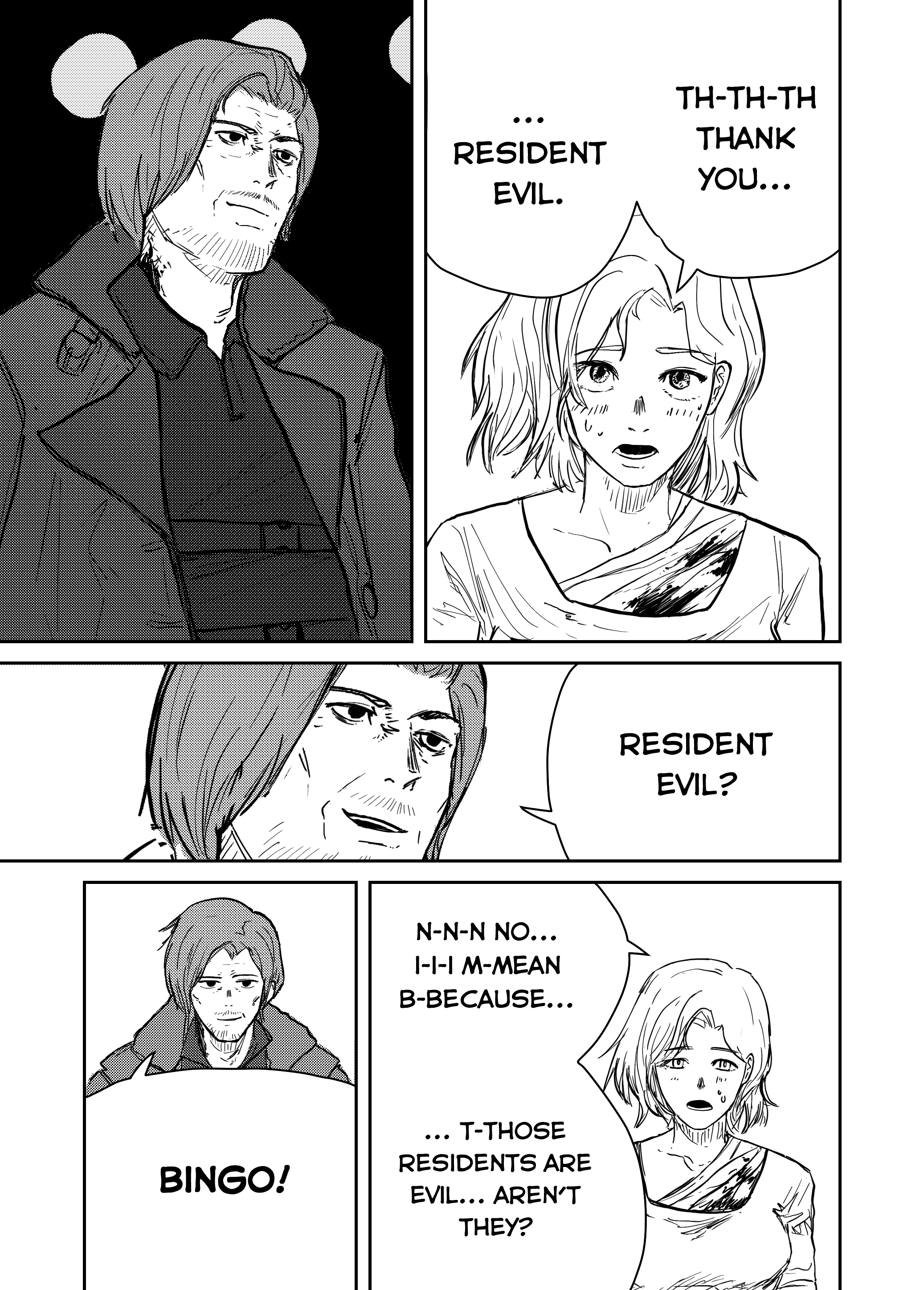 1boy 1girl absurdres beard beard_stubble chainsaw_man coat commentary english_commentary english_text facial_hair forced_title_drop fujimoto_tatsuki_(style) grace_ashcroft highres kq_minh leon_s._kennedy meme monochrome open_clothes open_coat parody resident_evil resident_evil_requiem shirt stubble thank_you_chainsaw_man_(meme)