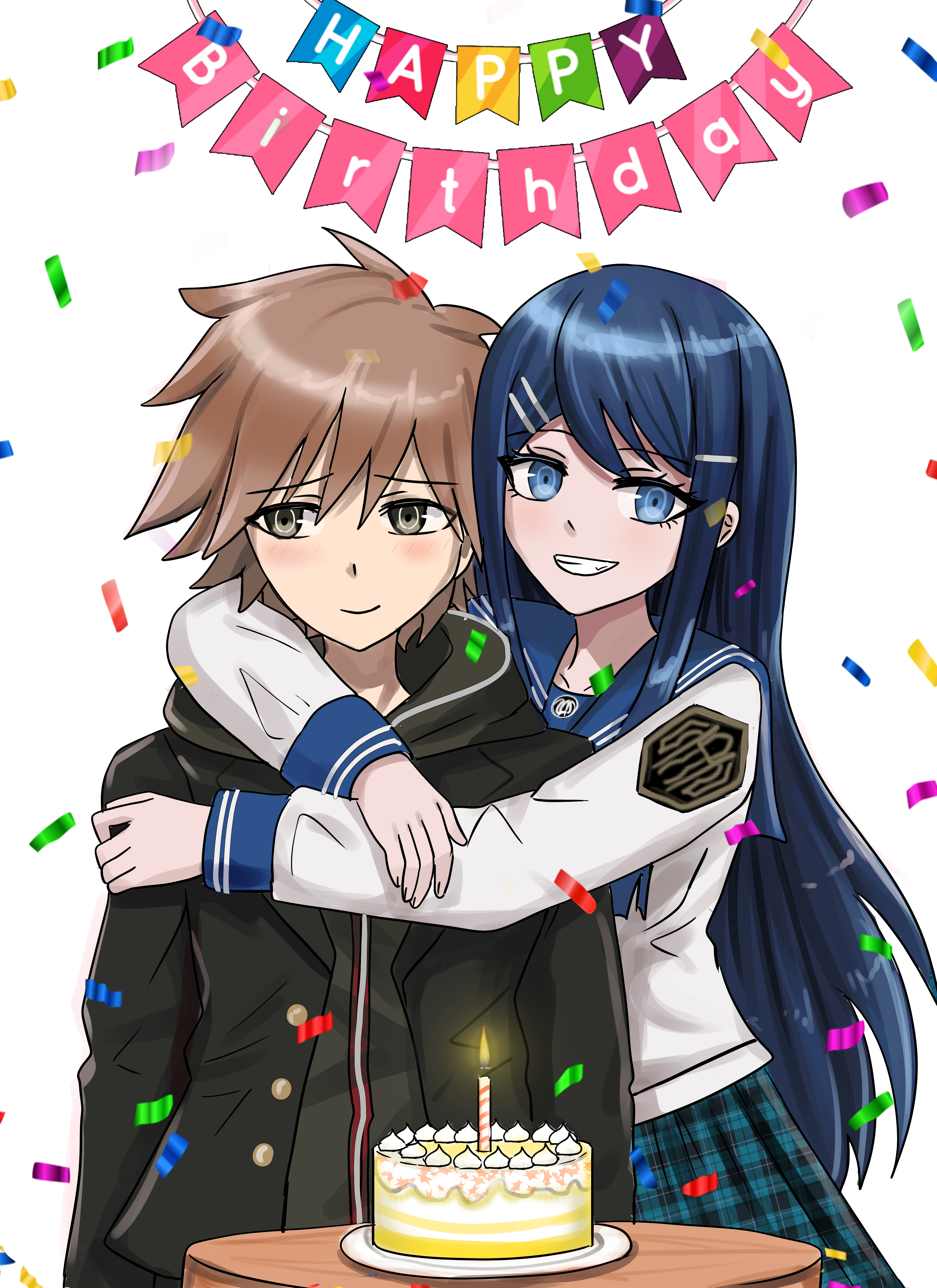 absurdres blue_eyes blue_hair cake commission danganronpa:_trigger_happy_havoc danganronpa_(series) fiverr_commission food hair_ornament hairclip happy_birthday highres jacket long_hair maizono_sayaka naegi_makoto school_uniform tanitiart