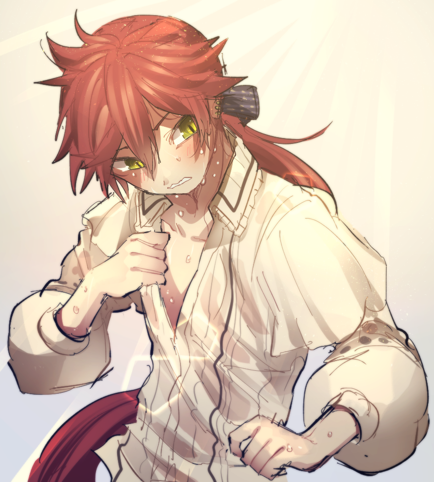 1boy charles_perrault_(grimms_notes) charles_perrault_(original)_(grimms_notes) clenched_teeth ear_piercing fighting_stance gradient_background grimms_notes hair_ribbon hand_up long_hair long_sleeves low_ponytail male_focus no_vest piercing ponytail puffy_long_sleeves puffy_sleeves red_hair ribbon shirt solo sweat teeth white_background white_shirt yako_(pzy) yellow_eyes