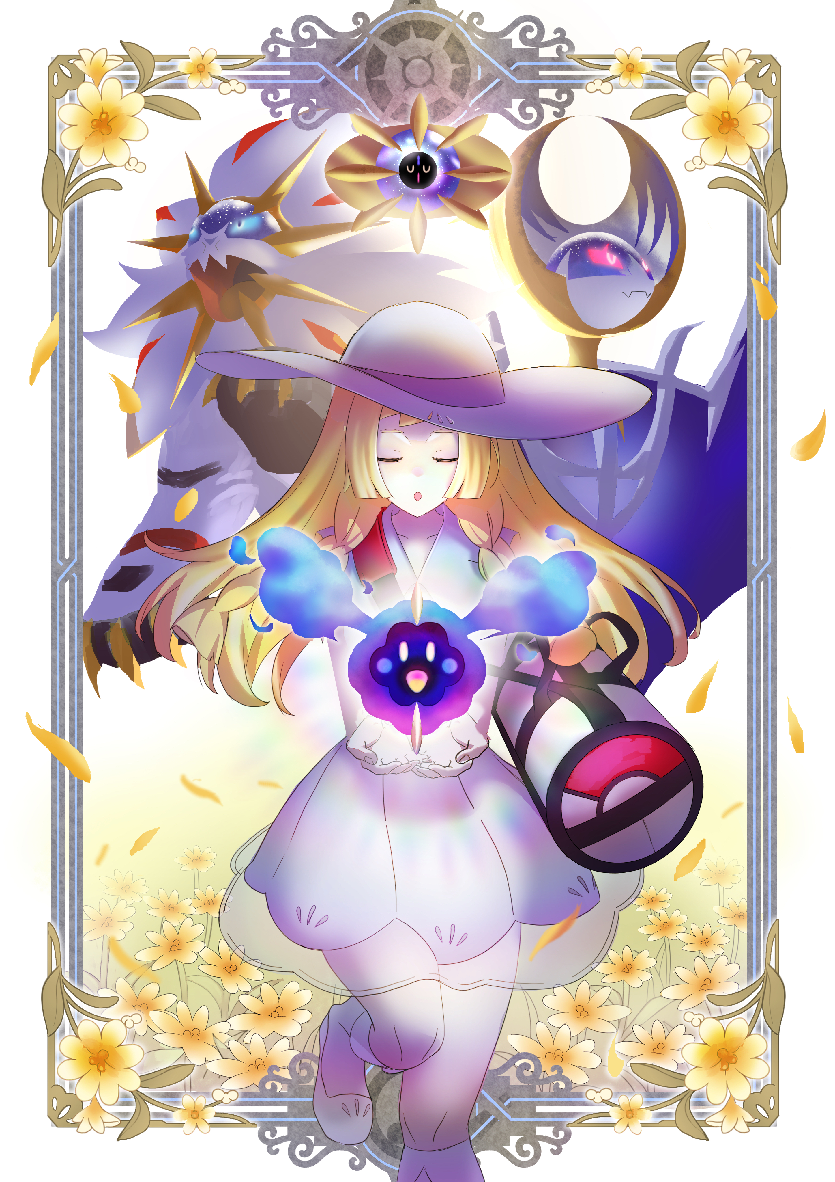 1girl bag blonde_hair cain1793 closed_eyes cosmoem cosmog dress evolutionary_line flower gen_7_pokemon legendary_pokemon lillie_(pokemon) long_hair lunala nintendo open_mouth petals pokemon pokemon_(creature) pokemon_sun_and_moon solgaleo standing standing_on_one_leg yellow_eyes