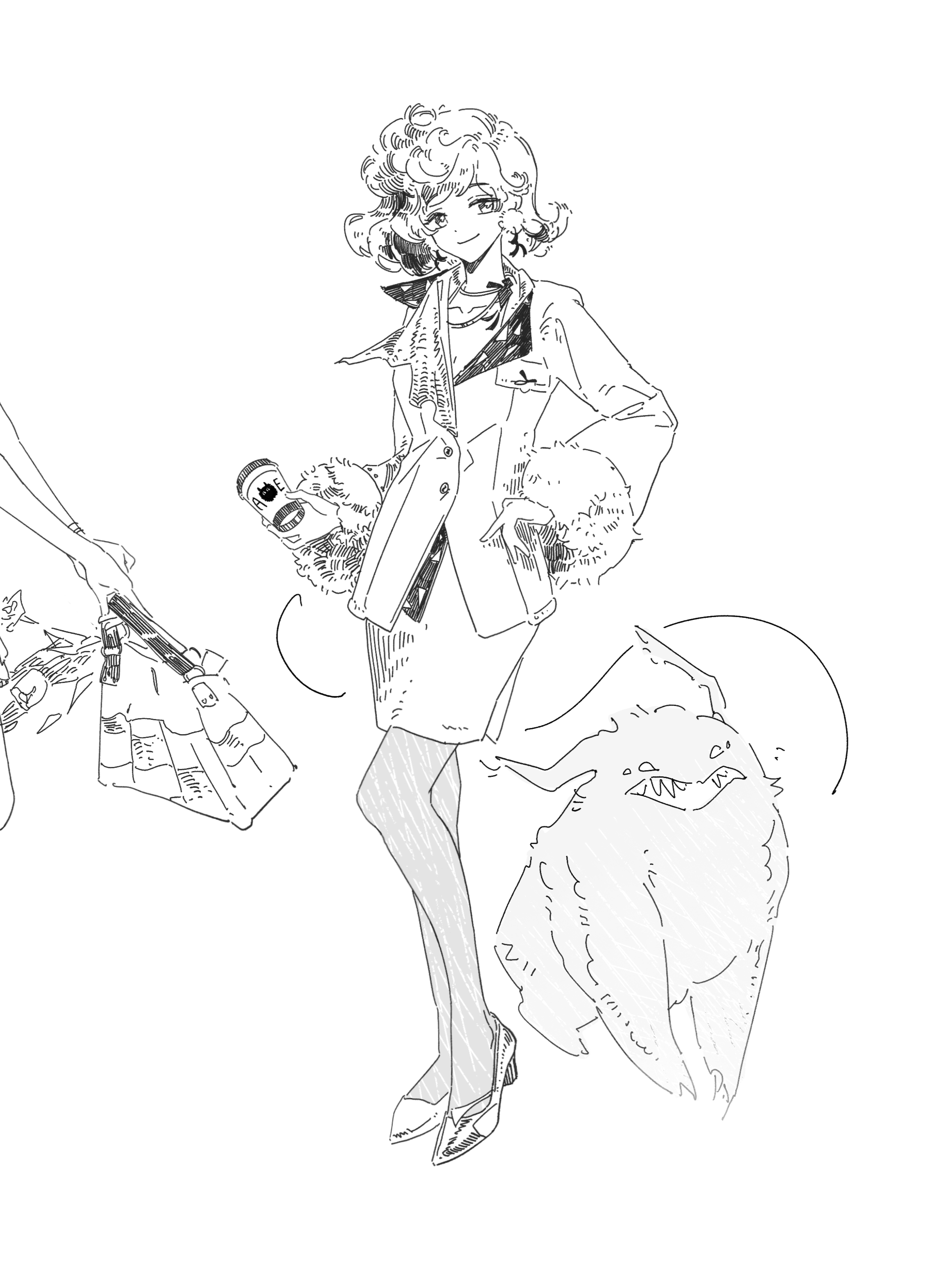 1girl 1other absurdres chinese_commentary closed_mouth commentary_request creature cup earrings full_body greyscale hand_on_own_hip high_heels highres holding holding_cup jacket jewelry lineart looking_at_viewer miniskirt monochrome ms._newbabel pantyhose pencil_skirt pom_pom_(clothes) pom_pom_earrings reverse:1999 short_hair skirt smile solo_focus standing white_background xiaoxiaowu