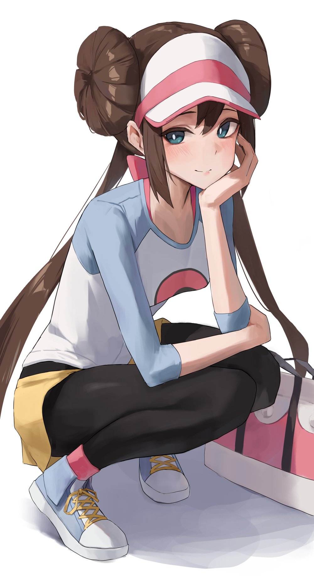 1girl bag black_pantyhose blue_eyes blush bow brown_hair closed_mouth donut_hair_bun double_bun full_body hair_bun hand_on_own_chin head_rest highres long_hair looking_at_viewer nintendo pantyhose pantyhose_under_shorts pink_bow pokemon pokemon_black_2_and_white_2 raglan_sleeves rosa_(pokemon) shiroshiroghost shirt shoes short_shorts shorts simple_background smile sneakers solo squatting twintails very_long_hair visor_cap white_background yellow_shorts
