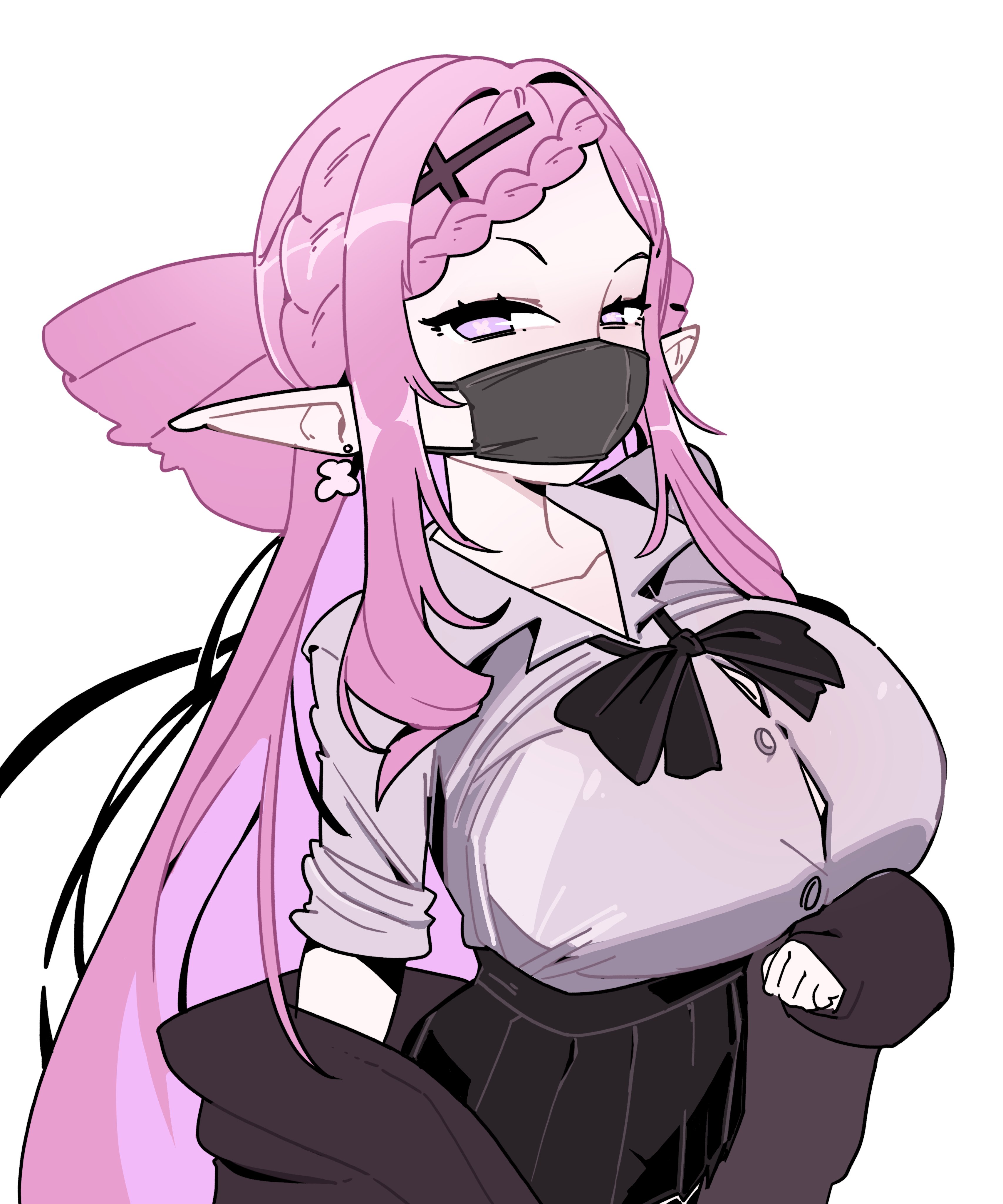 breasts buttons coat_partially_removed drill_hair jushikuroni large_breasts long_hair malice_evermore mask mouth_mask phase_connect pink_eyes pink_hair pointy_ears ribbon shirt skirt tagme twin_drills virtual_youtuber