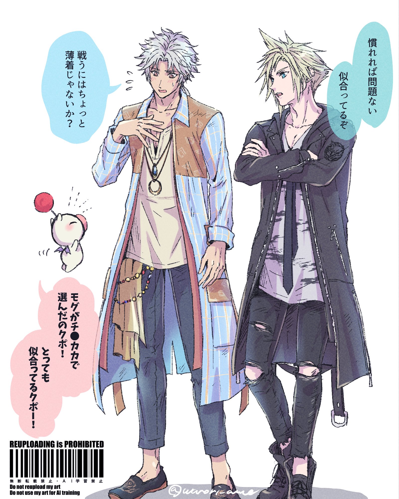 2boys barcode black_boots black_coat black_necktie black_pants black_shoes blonde_hair blue_eyes boots brown_hair cloud_strife cloud_strife_(urban_wolf) coat collared_shirt commentary_request crossed_arms dissidia_duellum_final_fantasy dissidia_final_fantasy final_fantasy final_fantasy_ii final_fantasy_vii firion flying_sweatdrops full_body grey_hair hand_on_own_chest highres jewelry long_coat long_shirt loose_necktie low_ponytail male_focus moogle multiple_boys multiple_necklaces necklace necktie official_alternate_costume pants parted_lips ponytail print_shirt shirt shoes short_hair spiked_hair sweatdrop torn_clothes torn_pants twitter_username warori_anne white_background