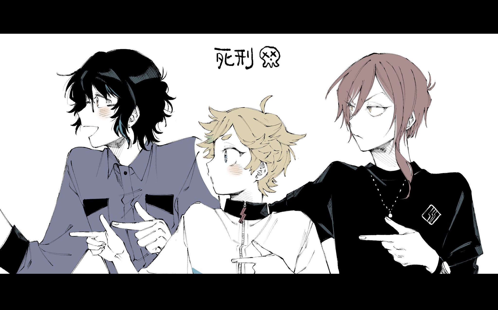 3boys ahoge aoba_tsumugi black_hair black_shirt blonde_hair blue_eyes blue_shirt blue_streaks blush breast_pocket buttons collared_shirt commentary_request double_finger_gun ensemble_stars! finger_gun fingernails glasses green_streaks hands_up harukawa_sora highres jewelry letterboxed lightning_bolt_symbol long_single_sidelock looking_to_the_side male_focus multicolored_hair multiple_boys necklace open_mouth pocket pointing profile red_hair sakasaki_natsume saranheyo_onigiri shirt short_hair short_sleeves simple_background streaked_hair switch_(ensemble_stars!) three-quarter_sleeves watch white_background white_shirt white_streaks wristwatch yellow_eyes zipper