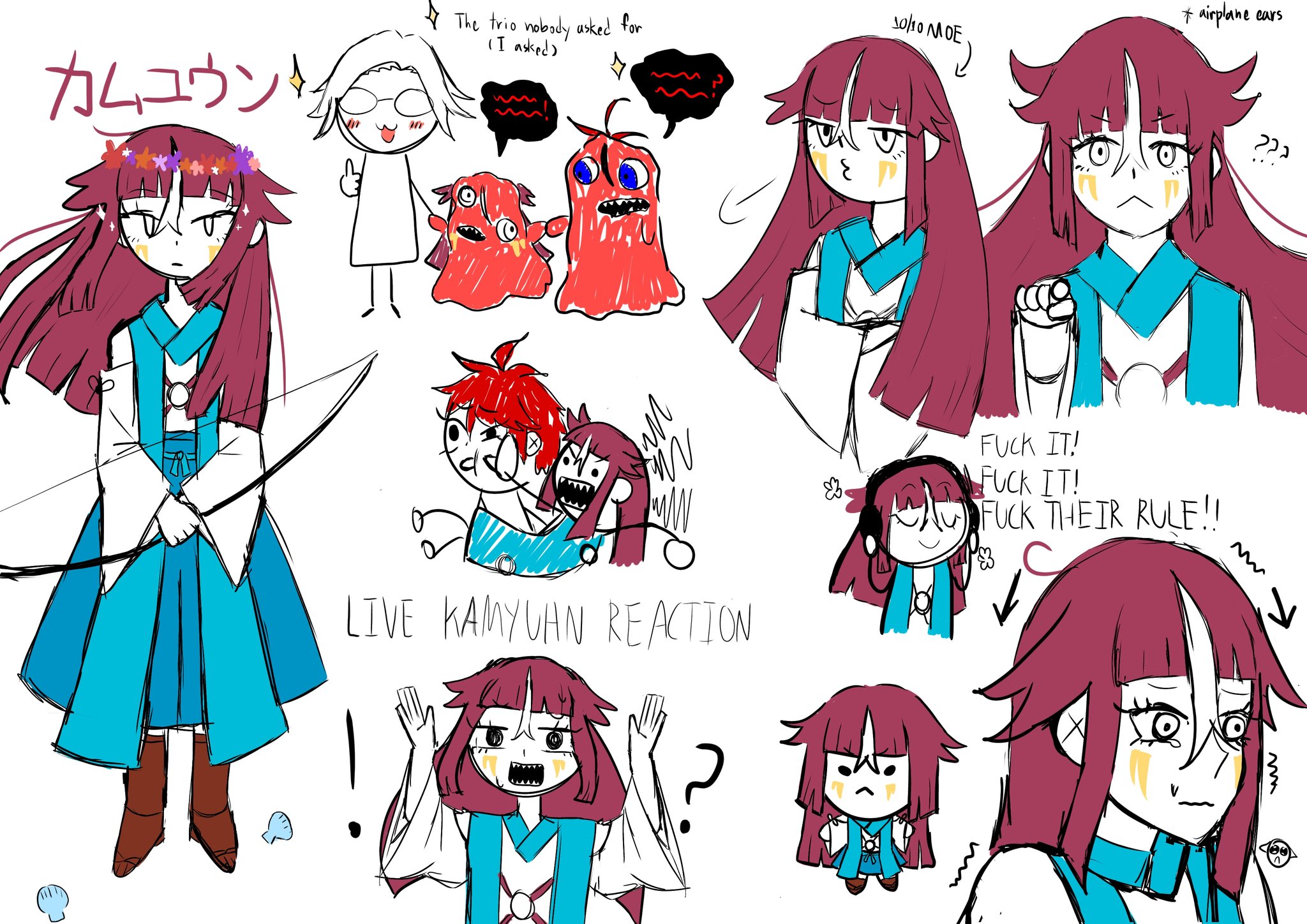 1girl 2boys ? a_name810 ahoge aotsuki_eito bow child detached_sleeves diamond_(shape) english_text female_focus head_wreath headphones japanese_text kamyuhn long_hair multicolored_hair multiple_boys red_hair simple_background sketch streaked_hair sumino_takumi the_hundred_line_-last_defense_academy- white_background white_hair