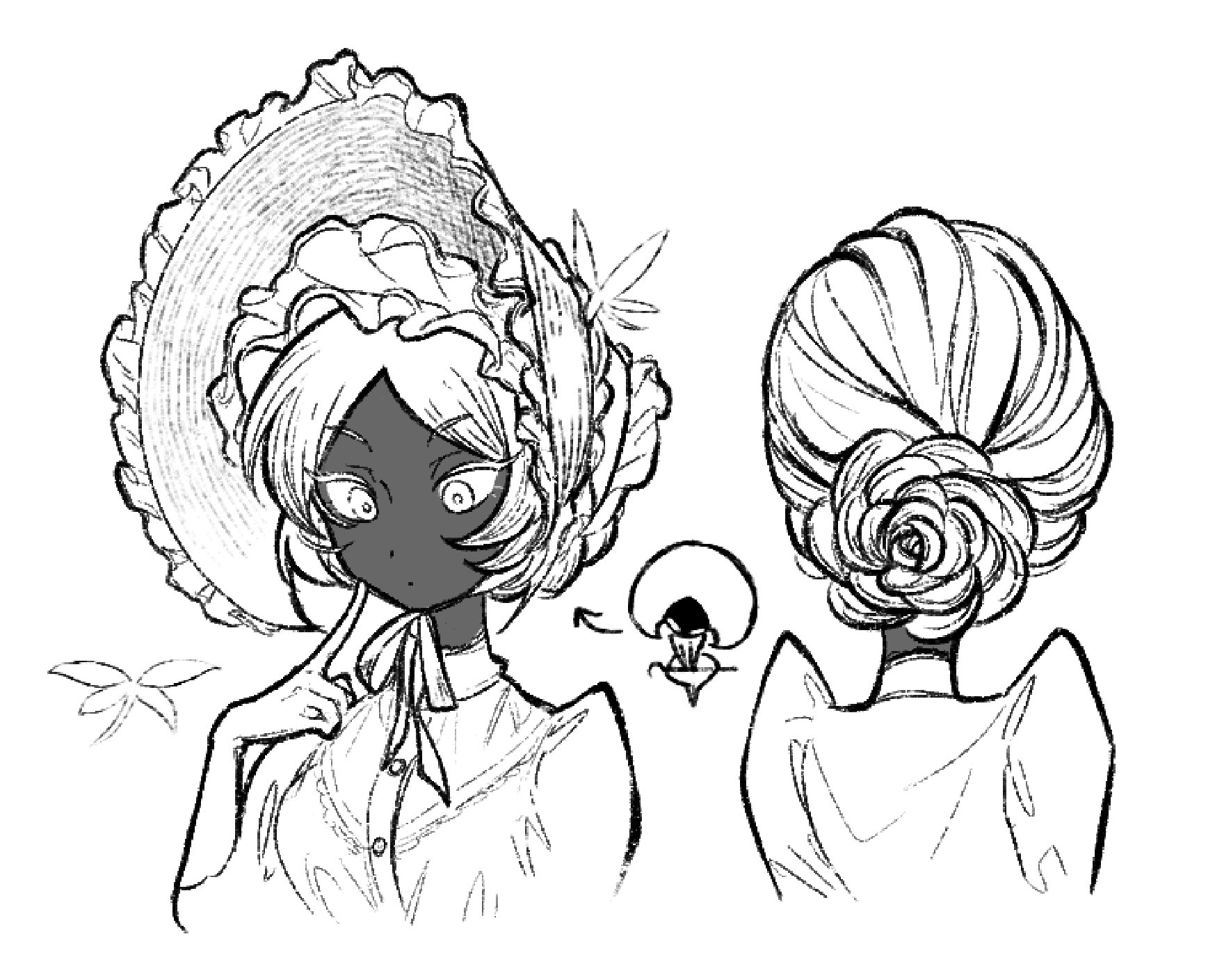 1girl aida_(aidacamelia0516) arrow_(symbol) bonnet breasts buttons closed_mouth colored_eyelashes commentary cropped_torso cutout_eyelashes dark-skinned_female dark_skin dot_mouth english_commentary expressionless finger_to_cheek frilled_bonnet frilled_shirt frills from_behind gloves greyscale hair_bun hand_up highres hollow_knight hollow_knight:_silksong humanization humanoid_and_humanization index_finger_raised lace_(hollow_knight) long_sleeves looking_down monochrome multiple_views pin_(hollow_knight) puffy_long_sleeves puffy_sleeves ribbon shirt short_hair simple_background single_hair_bun small_breasts turtleneck turtleneck_shirt v-shaped_eyebrows white_background