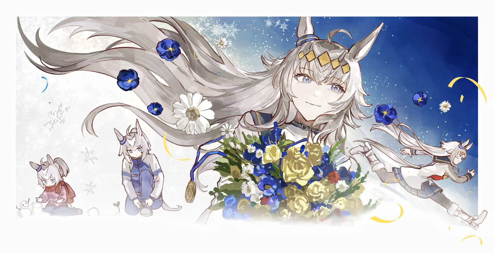 1girl age_progression ahoge animal_ears black_pantyhose blue_eyes blue_pants blue_sailor_collar blue_skirt boots bouquet brooch chinese_commentary closed_mouth commentary_request ear_ornament flower grey_hair grey_tail hair_between_eyes hairband highres holding holding_bouquet horse_ears horse_girl horse_tail jacket jewelry kasamatsu_tracen_training_uniform long_hair long_sleeves multicolored_hair multicolored_jacket nanjiaobeiyuan neckerchief oguri_cap_(starlight_beat)_(umamusume) oguri_cap_(umamusume) pants pantyhose pink_sweater pleated_skirt ponytail purple_jacket purple_pants purple_track_suit red_neckerchief red_scarf running sailor_collar scarf shirt skirt smile snowflakes star_brooch sweater tail track_jacket track_pants track_suit two-tone_jacket tying_footwear umamusume umamusume:_cinderella_gray white_boots white_jacket white_shirt