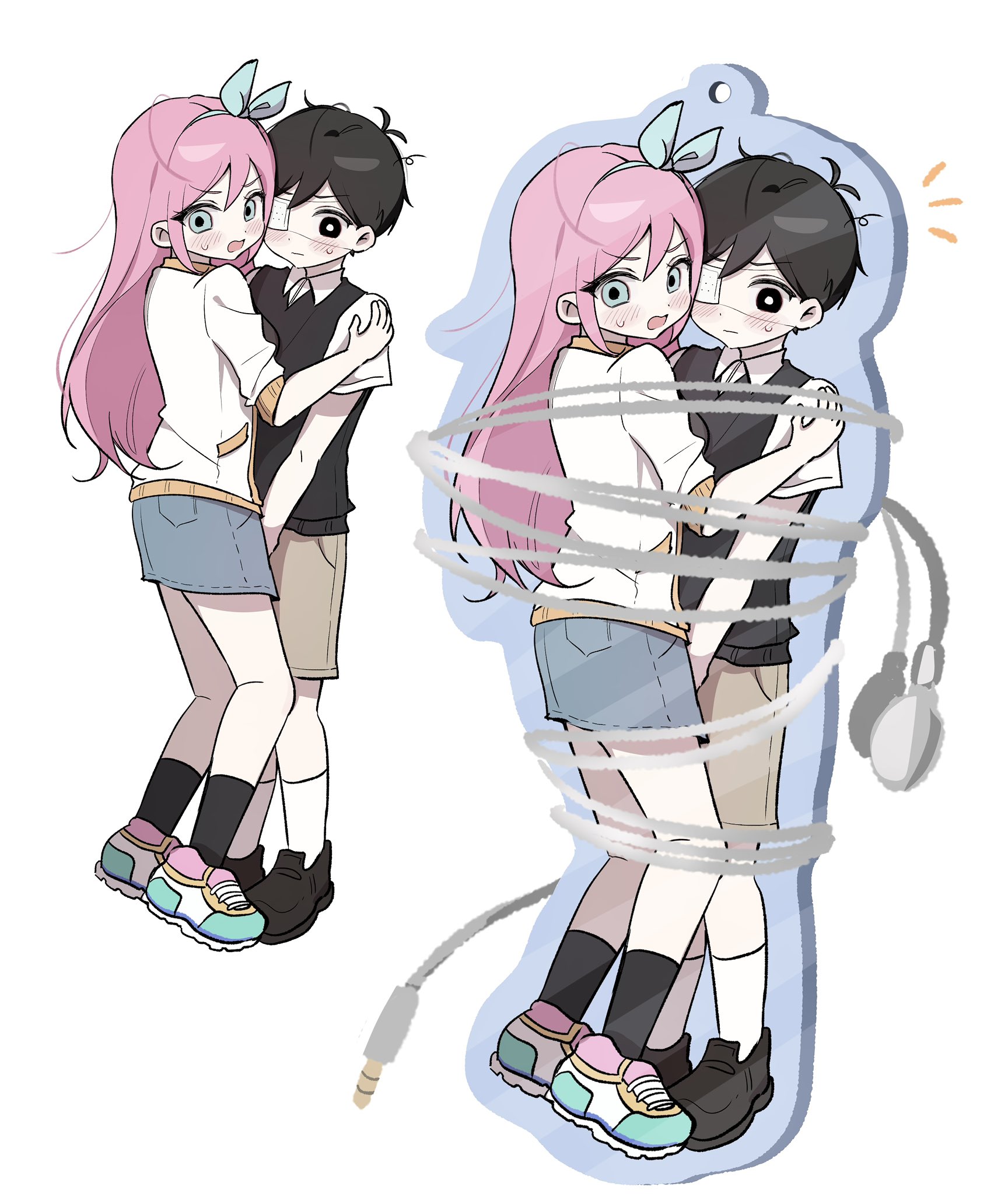 1boy 1girl antenna_hair aubrey_(faraway)_(omori) aubrey_(omori) black_eyes black_hair black_shoes black_socks black_sweater_vest blue_eyes blue_skirt blush brown_shorts closed_mouth collared_shirt commentary denim denim_skirt double-parted_bangs earbuds earphones eyepatch hair_between_eyes highres jacket korean_commentary loafers long_hair looking_at_viewer medical_eyepatch omori open_mouth pink_hair shirt shoes short-sleeved_jacket short_hair short_sleeves shorts sidelocks simple_background skirt sneakers socks spoilers sunny_(omori) sweatdrop sweater_vest white_background white_jacket white_shirt white_socks wktdms1