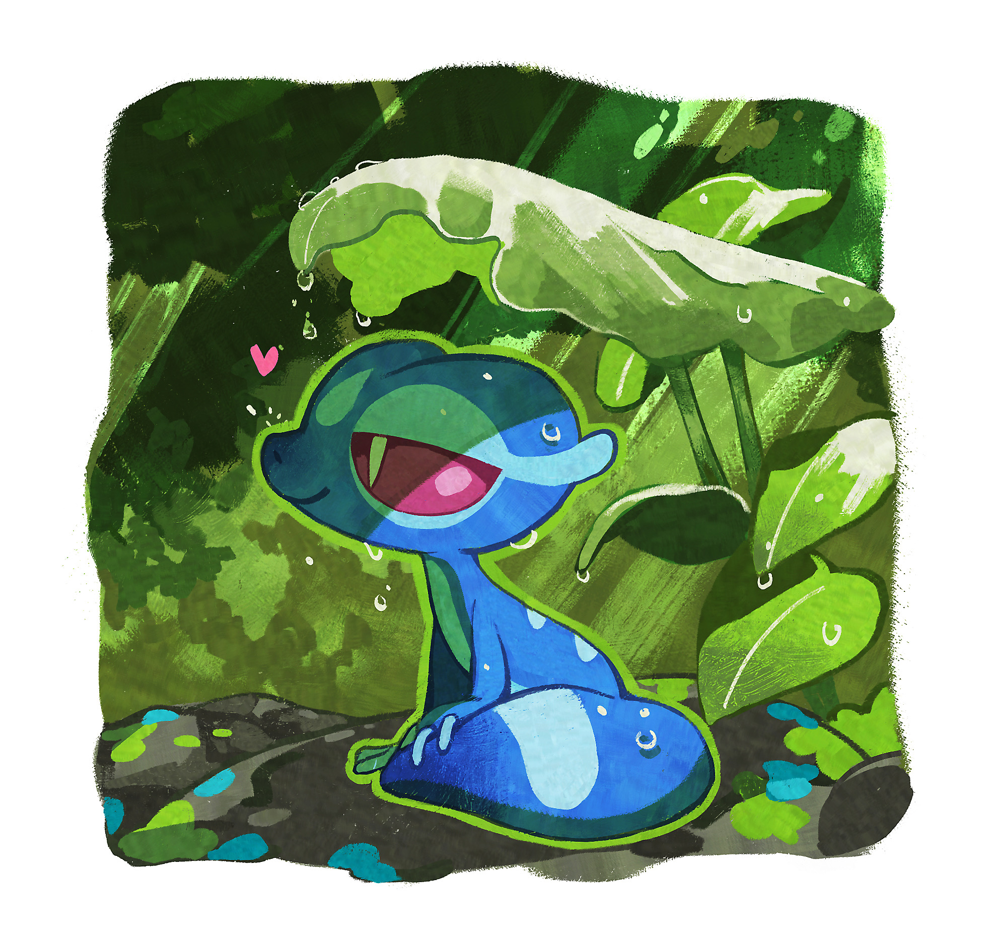 chinese_commentary commentary_request forest gecko gecqua heart highres leaf lizard nature nintendo no_humans pink_eyes pokemon pokemon_(creature) rain sitting solo solo_focus xiaolumiaoliya