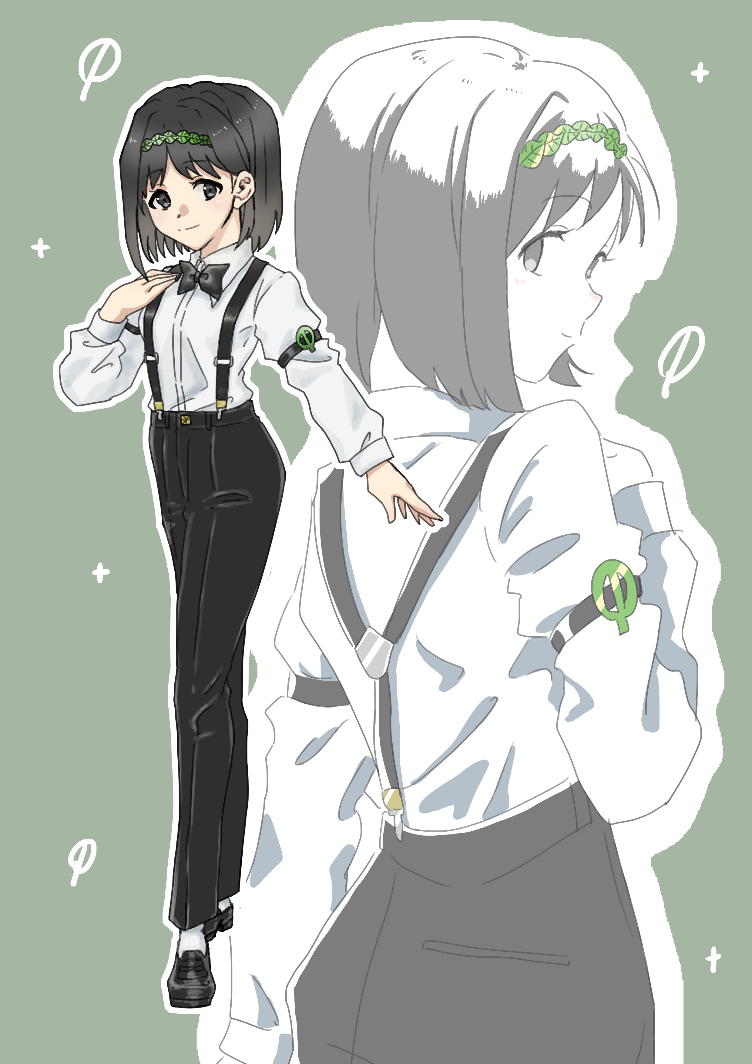 1girl absurdres alternate_costume black_bow black_bowtie black_hair black_pants black_shoes bow bowtie commentary_request erika_(pokemon) green_background highres looking_at_viewer looking_back nezuyatai_odai nintendo outline pants pokemon pokemon_red/green/blue/yellow shirt shoes solo suspenders white_outline white_shirt zoom_layer