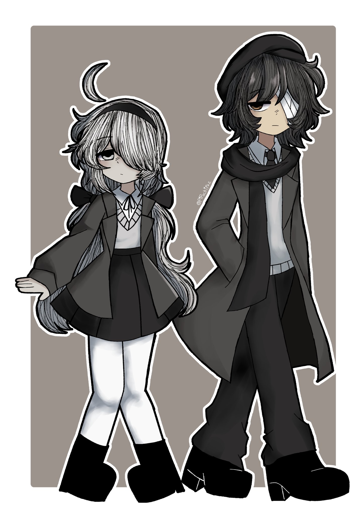 1boy 1girl ahoge bandage_over_one_eye beret black-hat black_bow black_hairband black_necktie black_pants black_scarf black_shoes black_skirt border bow brown_background brown_eyes character_request closed_mouth coat collared_shirt detached_ahoge expressionless grey_coat grey_hair grey_jacket hair_bow hair_over_one_eye hairband hat jacket long_hair looking_to_the_side low_twintails necktie outline pale_skin pants pipo_(pipochipzz) pleated_skirt scarf shirt shoes short_hair simple_background skirt thighhighs twintails twitter_username vest white_border white_eyes white_hair white_outline white_shirt white_thighhighs white_vest