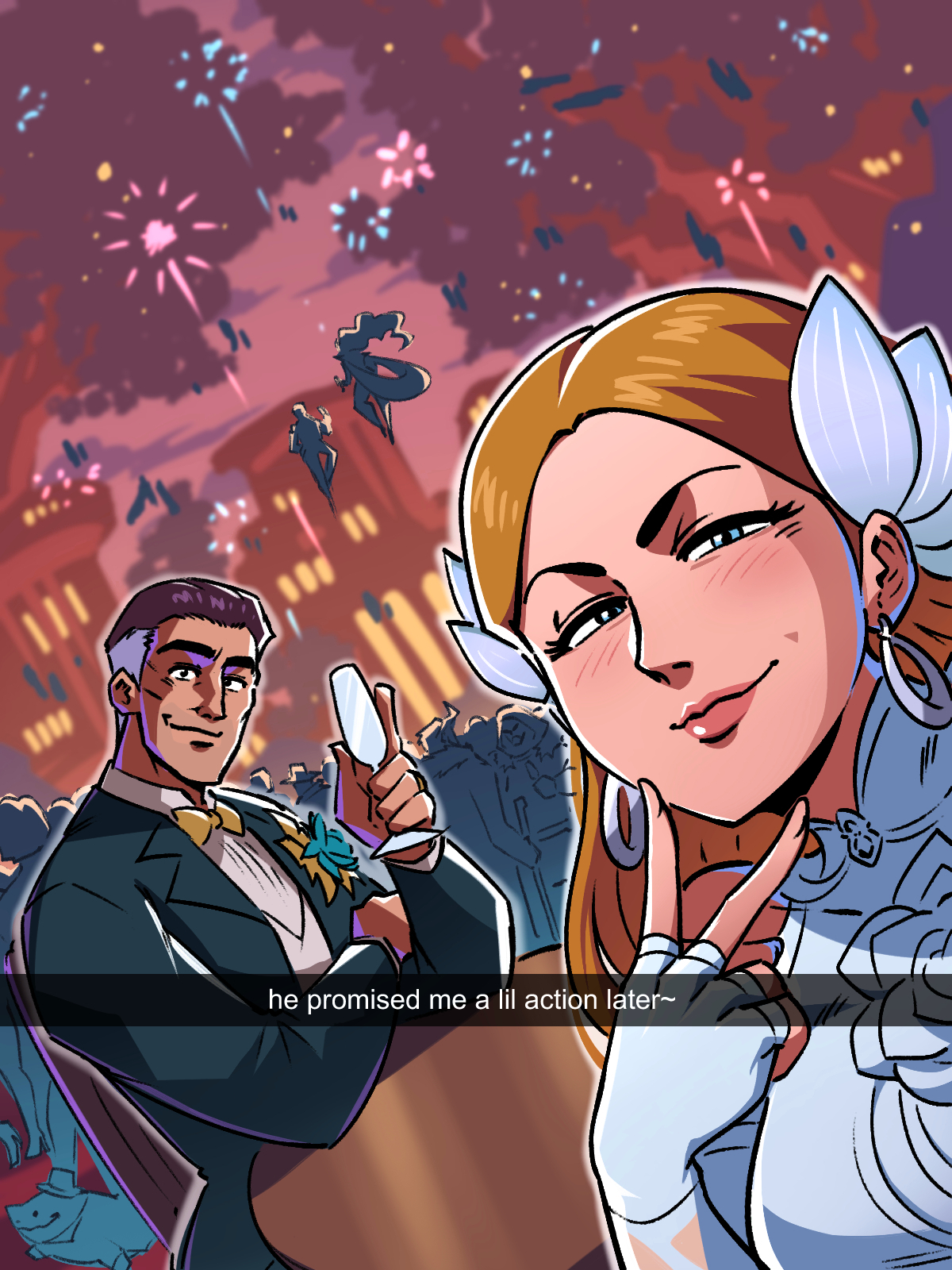 black_jacket blonde_hair blue_eyes bow breasts brown_hair champagne_flute character_name character_request cup doctor_doom drinking_glass dutch_angle earrings english_text fantastic_four fireworks highres holding holding_cup hoop_earrings husband_and_wife jacket jewelry large_breasts loki_(marvel) marvel marvel_rivals multicolored_hair reed_richards reed_richards_(the_life_fantastic) smile snapchat sue_storm sue_storm_(the_life_fantastic) table tina_fate tuxedo two-tone_hair white_hair yellow_bow
