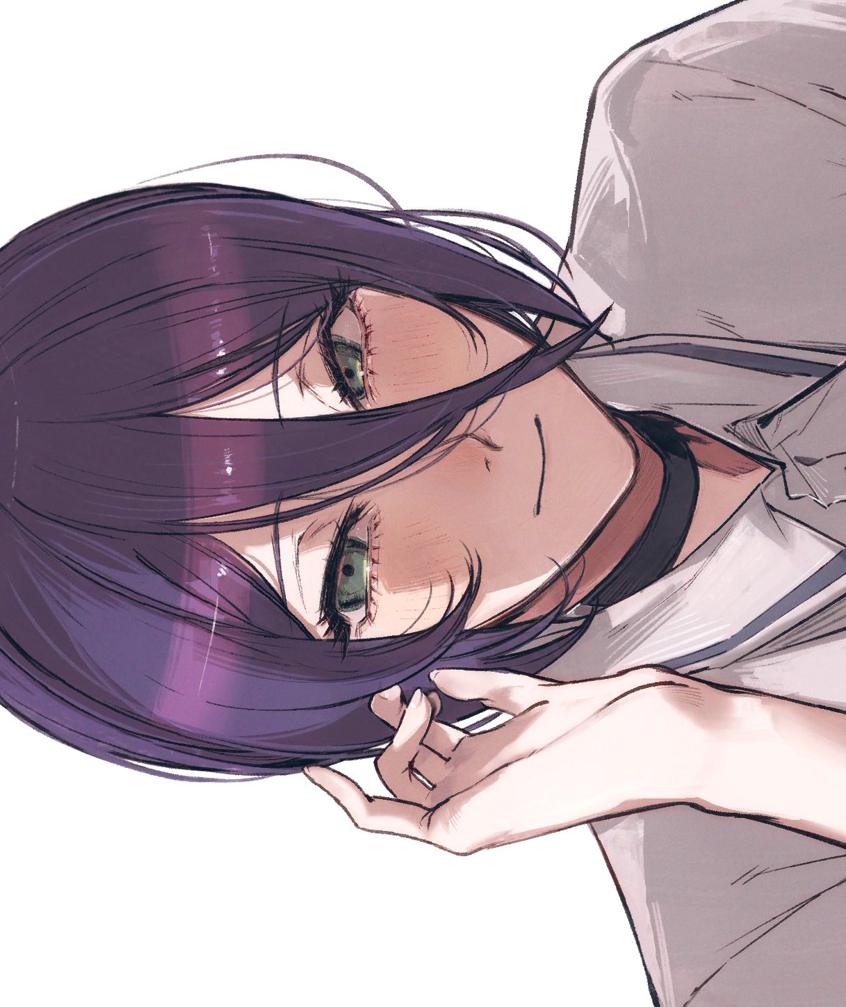 1girl black_choker chainsaw_man choker closed_mouth collared_shirt dodo_(dodobo) green_eyes hair_between_eyes hand_in_own_hair highres light_blush light_smile looking_at_viewer medium_hair purple_hair reze_(chainsaw_man) shirt solo updo upper_body white_background white_shirt