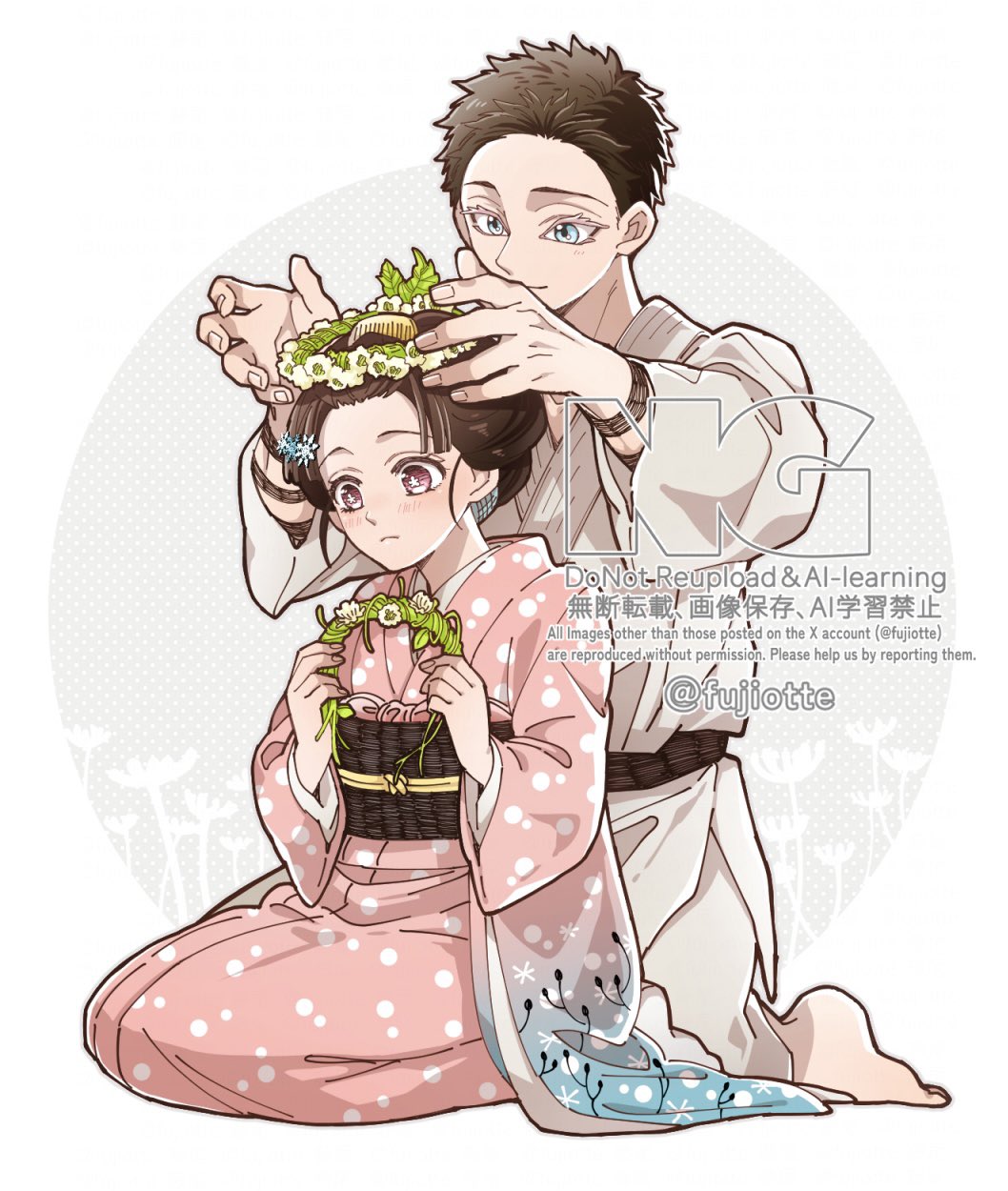 1boy 1girl barefoot black_hair blue_eyes body_markings comb flower-shaped_pupils fujiotte full_body hair_ornament hakuji_(kimetsu_no_yaiba) head_wreath highres holding_head_wreath japanese_clothes kimetsu_no_yaiba kimono kneeling koyuki_(kimetsu_no_yaiba) light_blush light_frown light_smile parted_bangs pink_eyes pink_kimono polka_dot polka_dot_kimono robe short_hair snowflake_hair_ornament symbol-shaped_pupils twitter_username updo white_background white_robe wide_sleeves