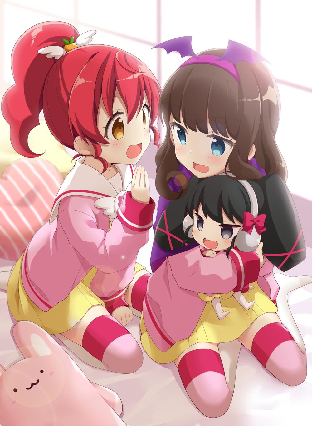 :d bat_wings blue_eyes blunt_bangs blush brown_eyes brown_hair capelet character_doll commentary_request doll dress eye_contact fang flipped_hair food-themed_hair_ornament gaaruru_(pripara) hair_ornament hairband highres jacket komo_wan110 kurosu_aroma long_hair long_sleeves looking_at_another multicolored_thighhighs on_bed open_mouth paprika_private_academy_school_uniform pink_hairband pink_jacket pink_thighhighs ponytail pretty_series pripara purple_capelet red_hair sailor_collar school_uniform seiza shiratama_mikan short_dress sidelocks sitting smile tareme thighhighs tsurime two-tone_thighhighs white_sailor_collar white_thighhighs wing_hair_ornament wings yellow_dress yokozuwari