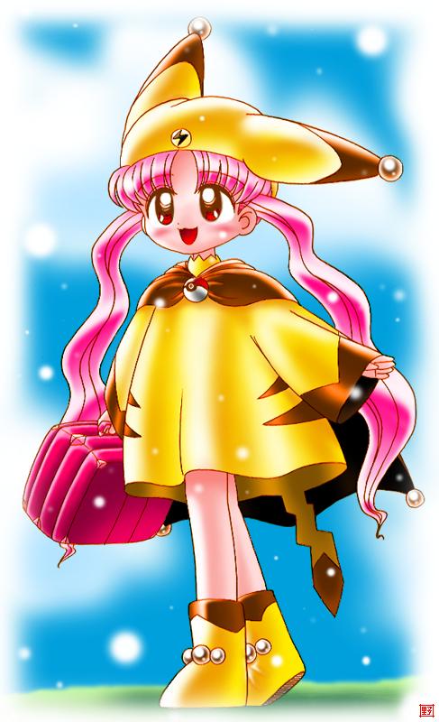1girl animal_ear_headwear artist_name bad_id bag boots border brown_cape cape cosplay day dress energy_(pokemon_tcg) fading_border fake_animal_ears fake_tail full_body gem gen_1_pokemon hat heel_up holding holding_bag iseno_yajin lightning_bolt_symbol long_hair long_sleeves nintendo open_mouth outdoors pikachu pikachu_(cosplay) pink_bag pink_hair poke_ball poke_ball_(basic) poke_ball_symbol pokemon pokemon_tcg princess_silver red_eyes sleeves_past_wrists smile solo standing tail twintails very_long_hair white_border wide_sleeves yellow_boots yellow_dress yellow_gem yellow_hat yume_no_crayon_oukoku