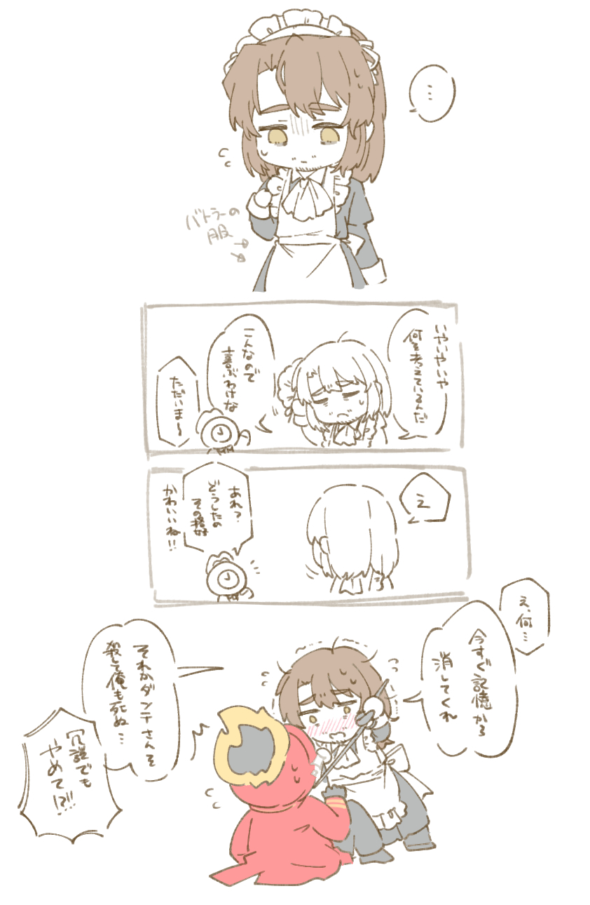 ... 1boy 1other 4koma =_= ^^^ absurdres ahoge alternate_costume apron back_bow bags_under_eyes beard_stubble black_dress black_fire black_gloves black_necktie black_pants black_shirt black_shoes blush bow brown_hair chibi clock closed_eyes closed_mouth clothes_pull coat collared_dress collared_shirt comic crossdressing crossdressing_(mtf) dante_(limbus_company) dress enmaided expressionless facial_hair fire flying_sweatdrops frilled_apron frilled_headdress frills full-face_blush gloves gregor_(project_moon) hair_between_eyes hair_down hair_intakes high_collar highres holding jitome juliet_sleeves lily26983455 limbus_company long_hair long_sleeves looking_at_another looking_down maid maid_apron maid_headdress male_maid necktie necktie_grab neckwear_grab nervous_sweating notice_lines object_head open_mouth pants parted_bangs partially_colored ponytail project_moon puffy_long_sleeves puffy_sleeves red_coat red_necktie sanpaku shirt shoes simple_background sitting speech_bubble spoken_ellipsis standing stubble sweat sweatdrop trembling white_apron white_background white_bow wuthering_heights_(identity)_(project_moon) yellow_eyes yellow_fire