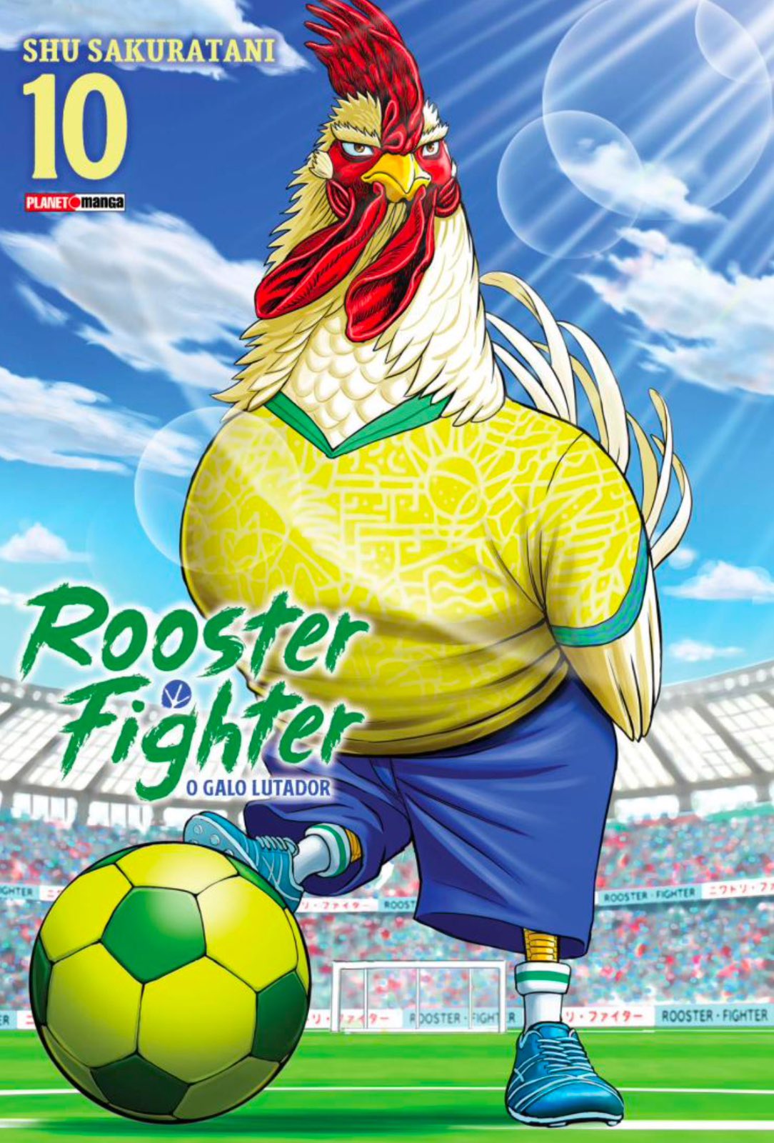 1boy 6+others ball bird blue_sky brazil brazilian_flag brazilian_flag_print chicken cloud cloudy_sky day flag_print jumping keiji_(niwatori_fighter) logo looking_ahead multiple_others niwatori_fighter official_art rooster sakuratani_shuu serious shirt simple_background sky soccer_ball soccer_uniform sportswear stadium standing wings yellow_shirt
