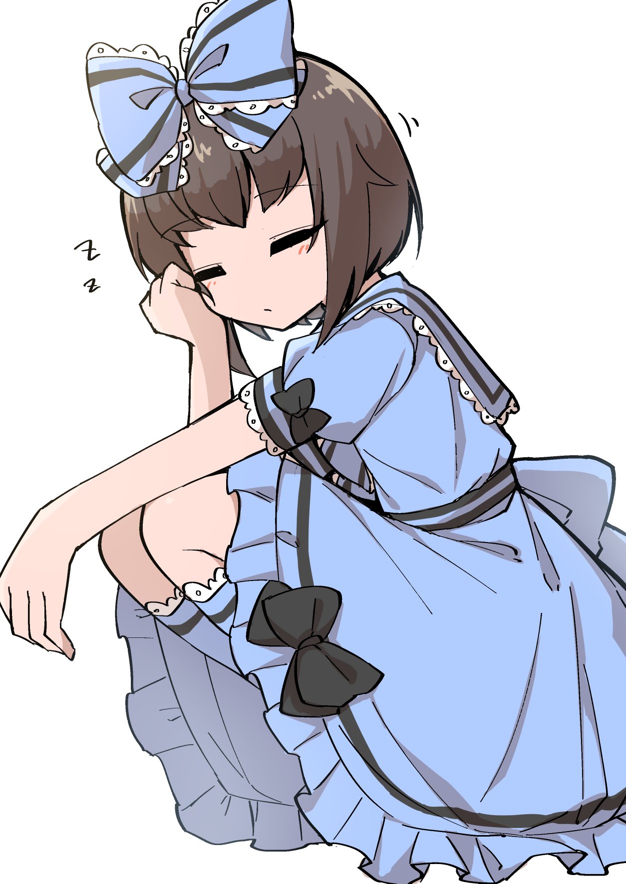 1boy arms_on_knees ayumu_(fun_bo) back_ribbon black_bow blue_bow blue_choker blue_dress blue_sailor_collar blue_socks bow brown_hair choker closed_eyes closed_mouth commentary crossdressing crossdressing_(mtf) dress dress_bow frilled_bow frilled_dress frilled_sailor_collar frilled_socks frills from_side fun_bo hair_bow highres kneehighs large_bow lolita_fashion male_focus original puffy_short_sleeves puffy_sleeves sailor_collar short_hair short_sleeves simple_background sleeping sleeve_bow socks solo squatting white_background zzz