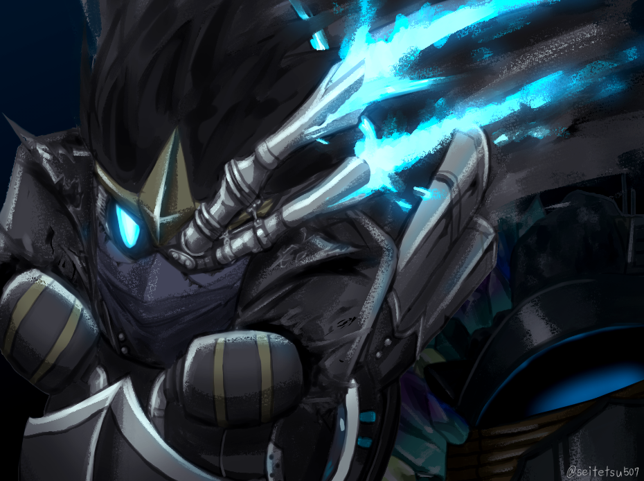 black_hair black_jacket blue_eyes blue_fire exhaust_pipe fire jacket kirby_(series) kirby_air_ride kirby_air_riders kiyo-giana nintendo noir_dedede torn_clothes torn_jacket twitter_username wheelie_(kirby)