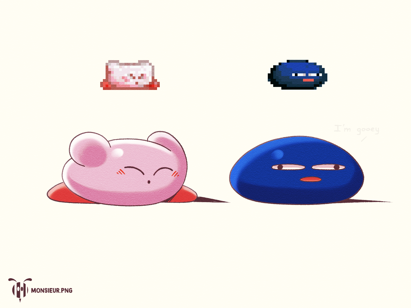 artist_logo blue_skin closed_eyes colored_skin derivative_work gooey_(kirby) kirby kirby's_dream_land_3 kirby_(series) logo monsieurdotpng nintendo no_humans pink_skin simple_background sprite_redraw wall-eyed white_background