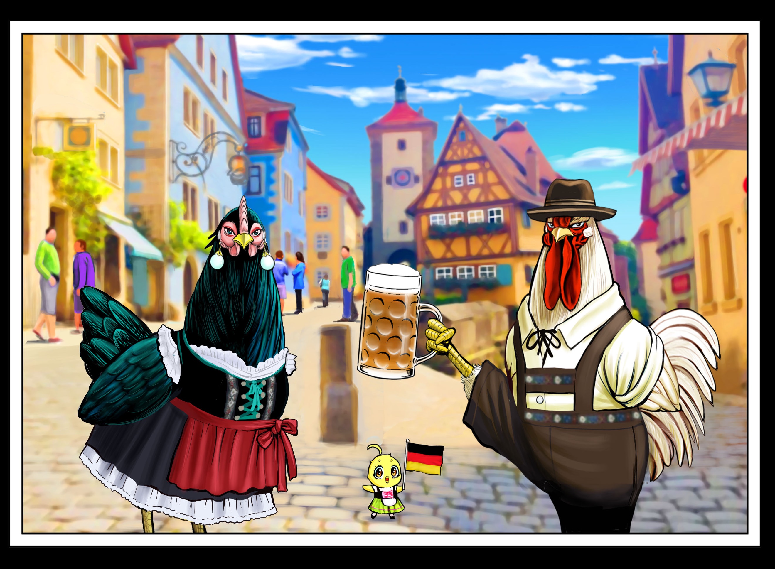 1girl 2girls alcohol baby_animal beer bird black_feathers chick chicken day dress earrings elizabeth_(niwatori_fighter) feathers german_clothes german_flag germany highres jewelry keiji_(niwatori_fighter) looking_at_viewer multiple_girls niwatori_fighter official_art open_mouth piyoko_(niwatori_fighter) road rooster sakuratani_shuu shirt simple_background spanish_text standing standing_on_one_leg street white_feathers yellow_feathers
