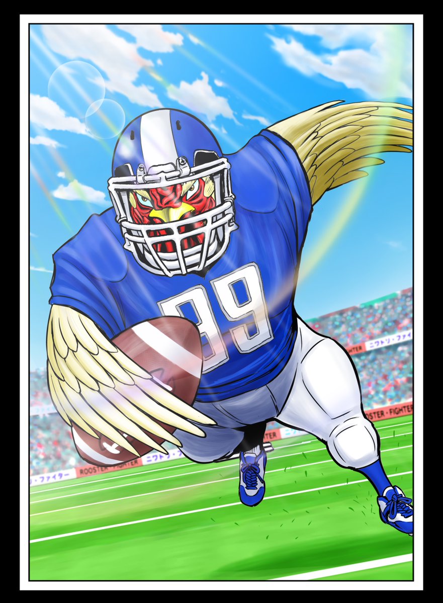 1boy 6+others american_football ball bird blue_sky brazilian_flag brazilian_flag_print chicken cloud cloudy_sky day flag_print jumping keiji_(niwatori_fighter) logo looking_ahead multiple_others niwatori_fighter official_art playing_sports rooster running sakuratani_shuu serious simple_background sky soccer_ball soccer_uniform sportswear stadium sunlight wings