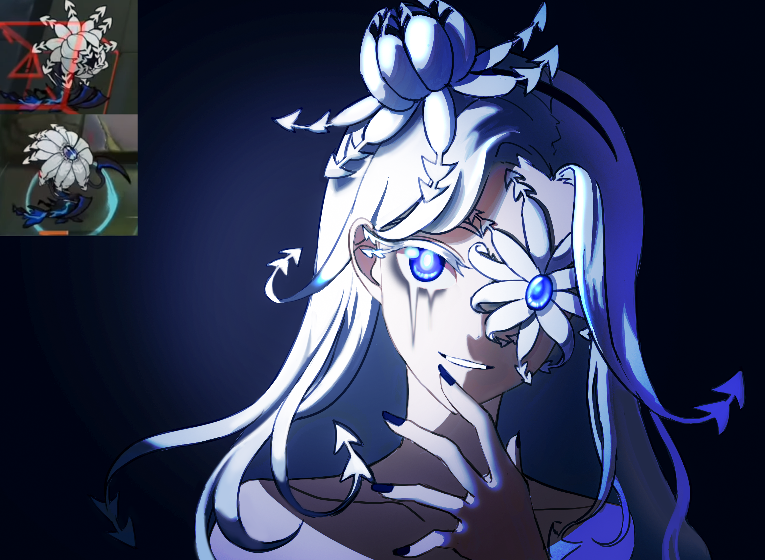 1girl arknights basin_sea_reaper_(arknights) black_hairband blue_background blue_eyes blue_nails commentary e7e6d2 english_commentary eyelashes flower flower_over_eye hair_flower hair_ornament hairband hand_up highres long_hair looking_at_viewer nail_polish personification screenshot_inset seaborn_(arknights) smile solo third-party_source upper_body white_flower white_hair