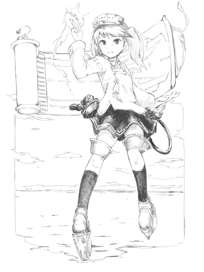 1girl bad_id bad_tumblr_id cloud commentary dated_commentary fang greyscale hat japanese_clothes kantai_collection kariginu kneehighs long_sleeves miniskirt monochrome nemubusoku onmyouji open_mouth outdoors rigging ryuujou_(kancolle) scroll shikigami skirt socks solo standing twintails visor_cap water