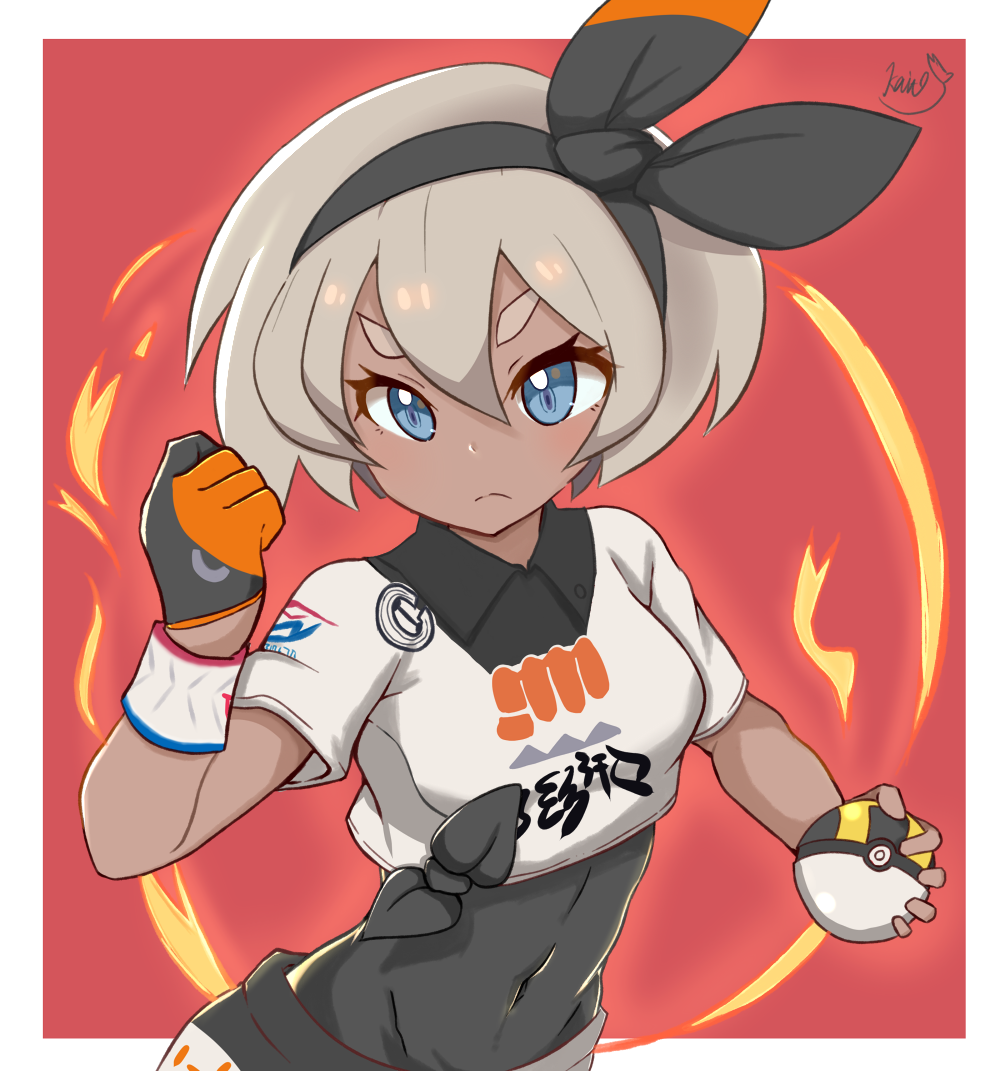 1girl bea_(pokemon) black_hairband blue_eyes blush border breasts clenched_hand closed_mouth commentary_request covered_abs covered_navel dark-skinned_female dark_skin dynamax_band eyelashes gloves grey_hair hair_between_eyes hairband holding holding_poke_ball kaito_(kaito921125) nintendo poke_ball pokemon pokemon_sword_and_shield red_background shirt short_hair short_sleeves signature single_glove small_breasts solo split_mouth thick_eyebrows ultra_ball upper_body white_border white_shirt