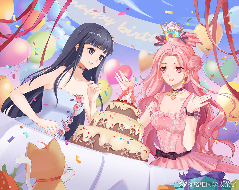 2girls ahoge animal balloon banner bare_arms bare_shoulders birthday birthday_cake black_bow black_hair blue_crown blue_dress blue_sky blunt_bangs bow bracelet breasts bright_pupils brown_eyes cake cat center_frills chain chinese_commentary choker cleavage cloak clothed_animal collarbone colorful_cake_tower_(shining_nikki) commentary_request confetti cowboy_shot crown cupcake day dress dress_flower ear_covers earrings flower food food-themed_hat forehead frilled_dress frills gift gold_chain gold_earrings gradient_sky hands_up happy happy_birthday hat hat_bow heart heart_balloon heart_choker heart_earrings hood hood_up hooded_cloak jewelry lace lace_choker lao_wei_tongxue_tai_cai_le long_hair looking_at_food mini_crown momo_(nikki) multiple_girls nikki_(nikki) nikki_(series) outdoors pink_bow pink_dress pink_flower pink_hair pink_rose pink_sky purple_choker rose shining_nikki sidelocks single_sidelock sky sleeveless sleeveless_dress standing strapless strapless_dress streamers stylist_(nikki) very_long_hair waist_bow wavy_hair whiskers white_cat white_choker white_pupils wrist_bow yellow_cloak