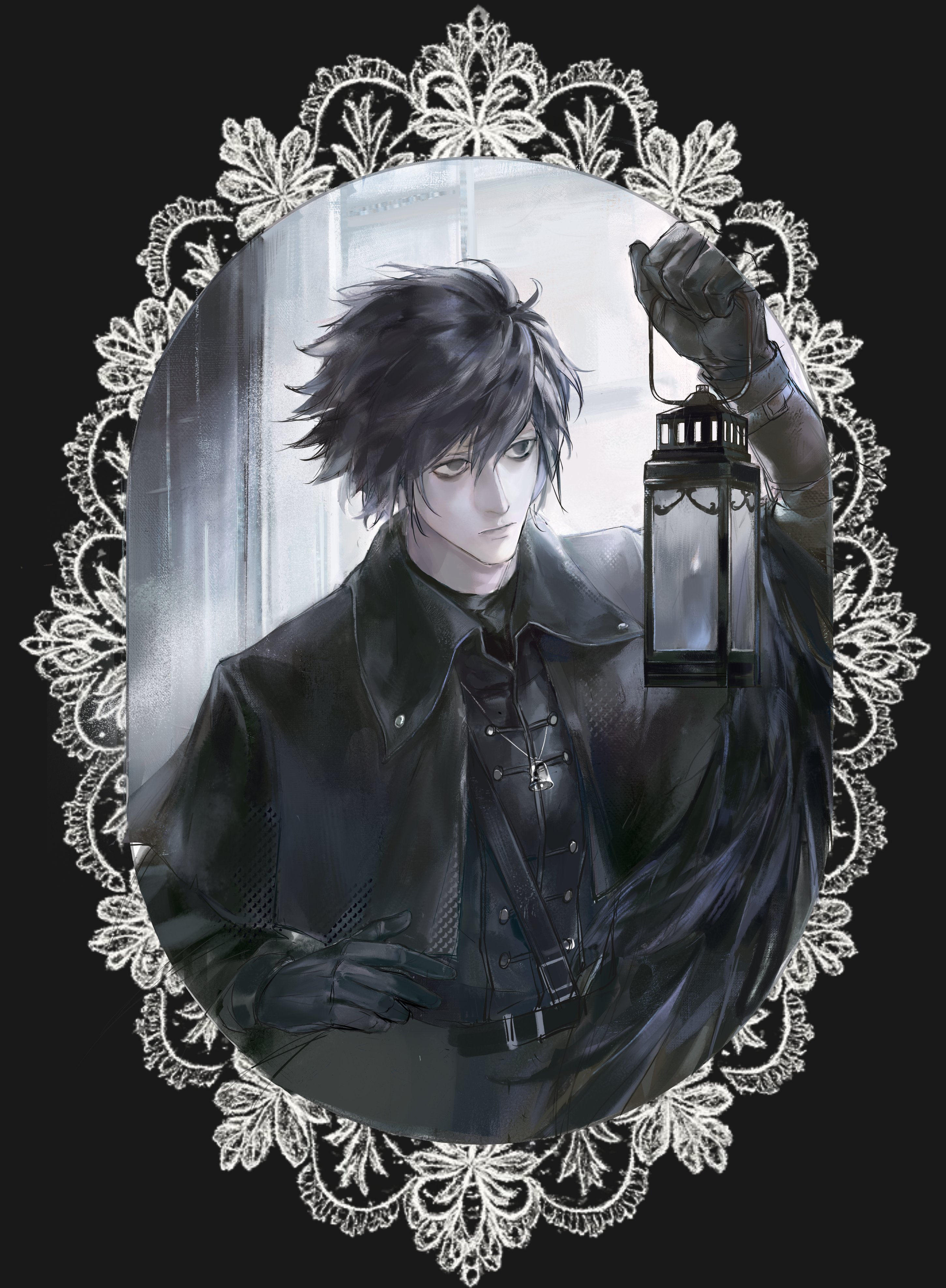 1boy absurdres alternate_costume arm_up belt black_background black_belt black_coat black_eyes black_hair black_shirt border closed_mouth coat collared_shirt commentary_request death_note eielnstar gloves hair_between_eyes highres holding holding_lantern l_(death_note) lantern long_sleeves male_focus ornate_border parted_bangs shirt simple_background solo wing_collar