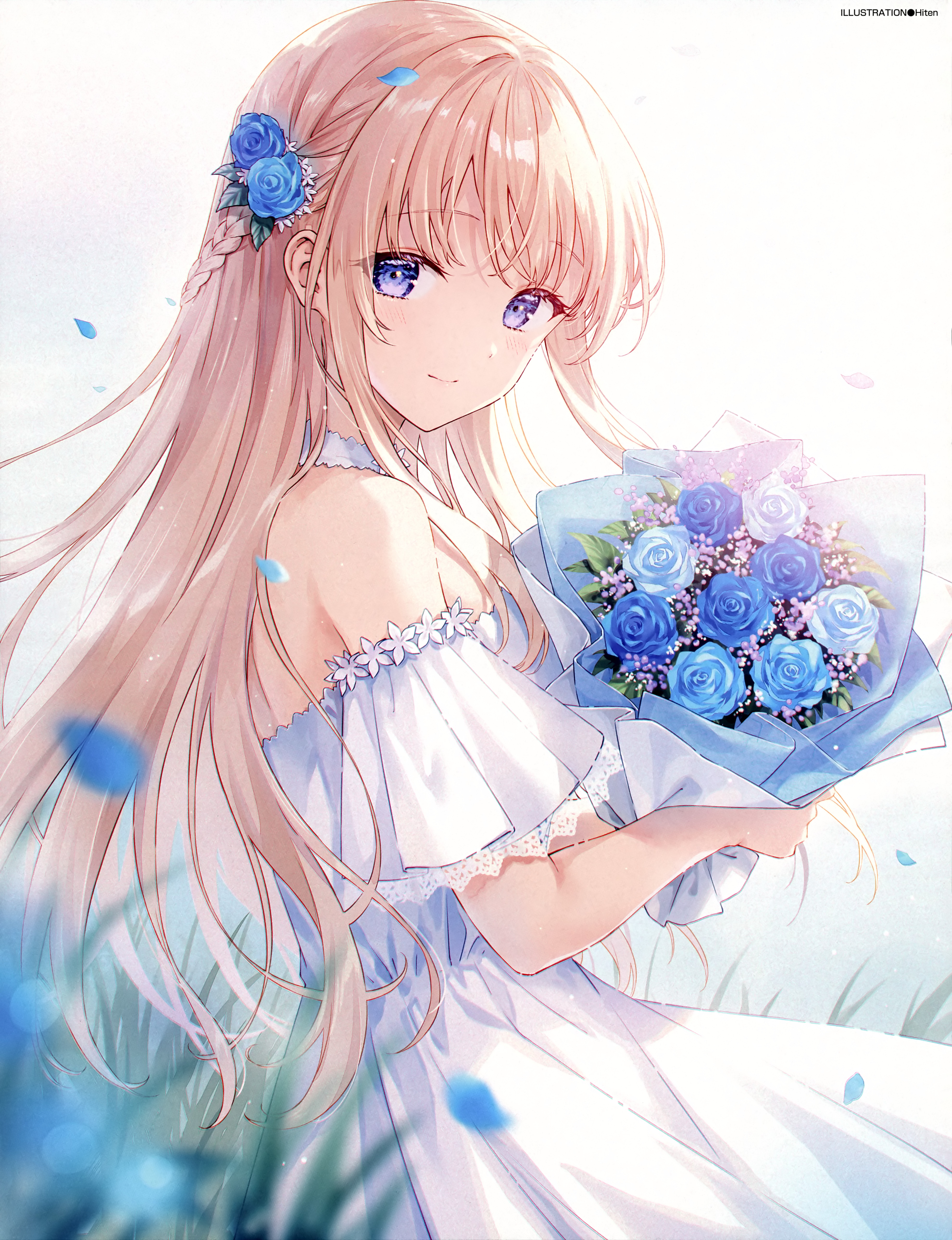 1girl absurdres armpit_crease artist_name blonde_hair blue_eyes blue_flower blue_petals bouquet braid choker closed_mouth cowboy_shot dengeki_moeoh dress falling_petals flower from_side grass hair_flower hair_ornament half_up_braid highres hiten_(hitenkei) holding holding_bouquet light_blush light_smile long_hair long_sidelocks looking_at_viewer looking_to_the_side magazine_scan off-shoulder_dress off_shoulder original petals scan sidelocks simple_background solo standing straight_hair third-party_source white_background white_choker white_dress