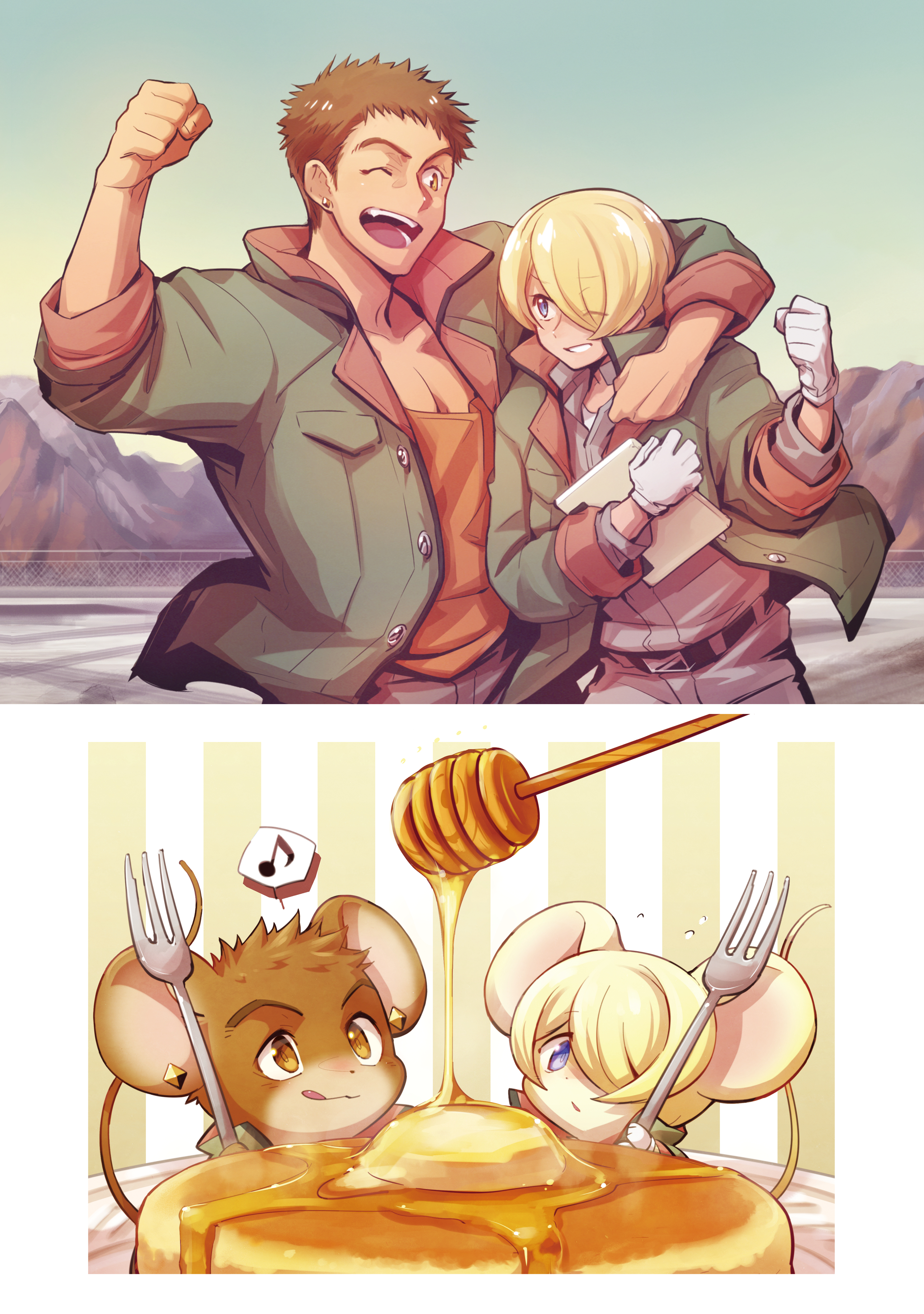 2boys absurdres animalization arm_around_shoulder blonde_hair brown_hair butter commentary_request food fork gloves green_jacket grin gundam gundam_tekketsu_no_orphans hair_over_one_eye highres holding holding_fork honey_dipper jacket male_focus mecyo_(mamezurushiki) mouse_(animal) multiple_boys musical_note norba_shino one_eye_closed open_mouth outdoors pancake person_and_animalization short_hair smile speech_bubble spoken_musical_note white_gloves yamagi_gilmerton