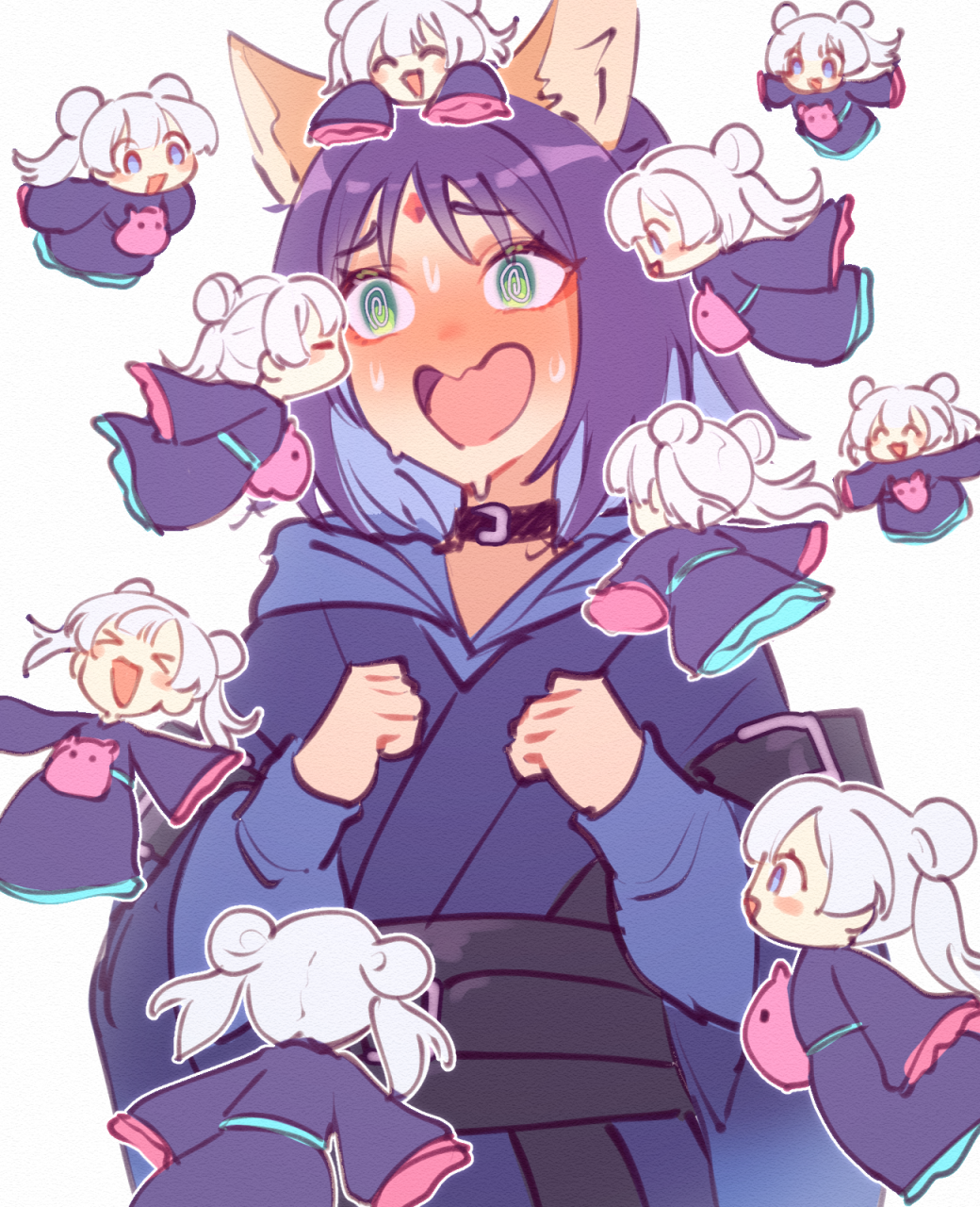>_< 6+girls animal_ears black_hair blue_eyes blue_hair blue_kimono blush cho_kaguya-hime! clone clone_harem closed_eyes colored_inner_hair commentary double_bun english_commentary flying fox_ears green_eyes hair_bun highres japanese_clothes kimono kiss kissing_cheek long_sleeves looking_at_another mini_person minigirl multicolored_hair multiple_girls open_mouth outstretched_arms purple_kimono runami_yachiyo sakayori_iroha sher_(imnotsher) sleeves_past_fingers sleeves_past_wrists smile sweat twintails two-tone_hair white_background wide_sleeves yuri
