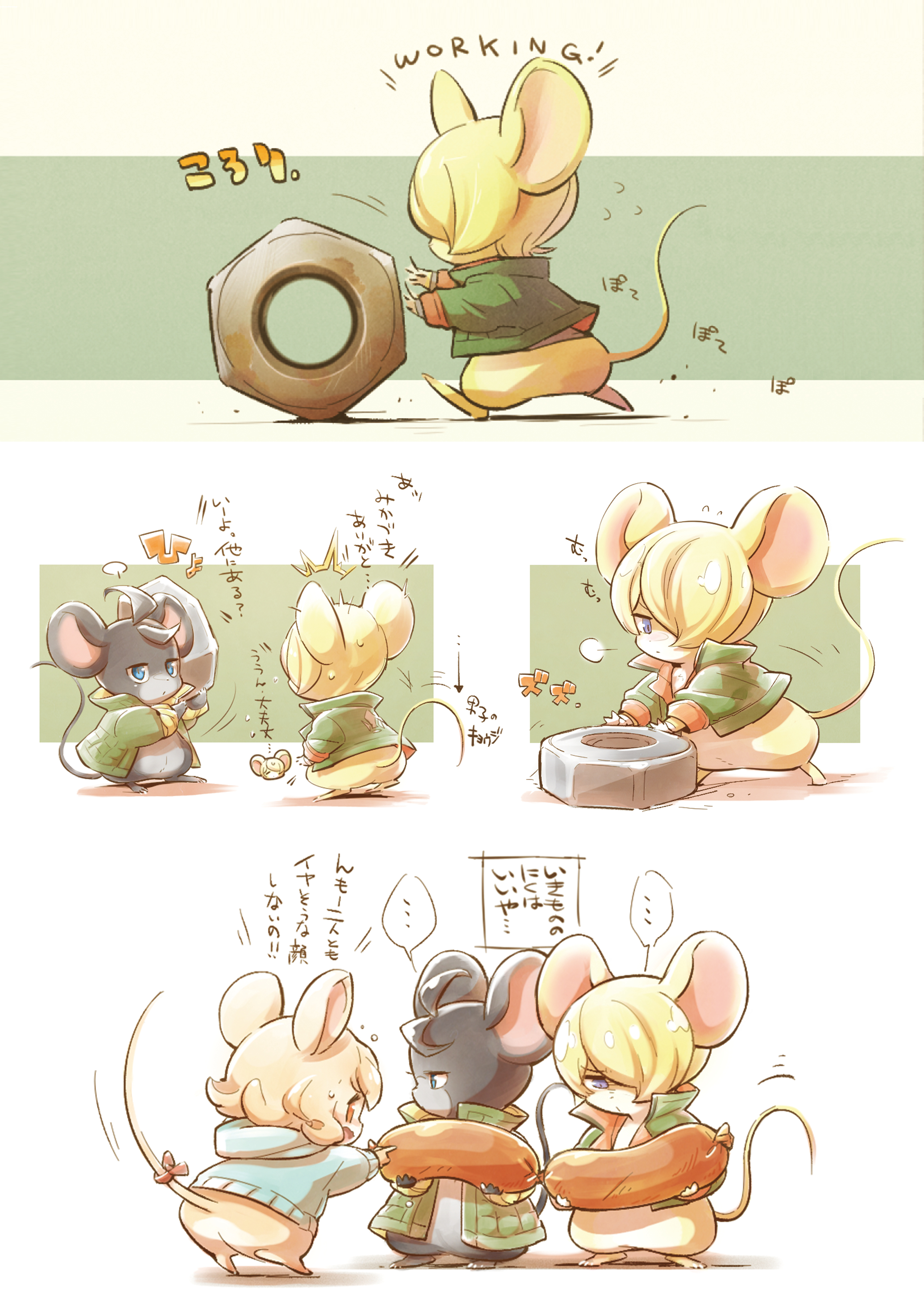 ... absurdres ahoge animal animalization arrow_(symbol) atra_mixta blonde_hair blue_eyes clothed_animal commentary_request food green_jacket gundam gundam_tekketsu_no_orphans highres jacket mecyo_(mamezurushiki) mikazuki_augus mouse_(animal) norba_shino nut_(hardware) sausage speech_bubble spoken_ellipsis translation_request yamagi_gilmerton