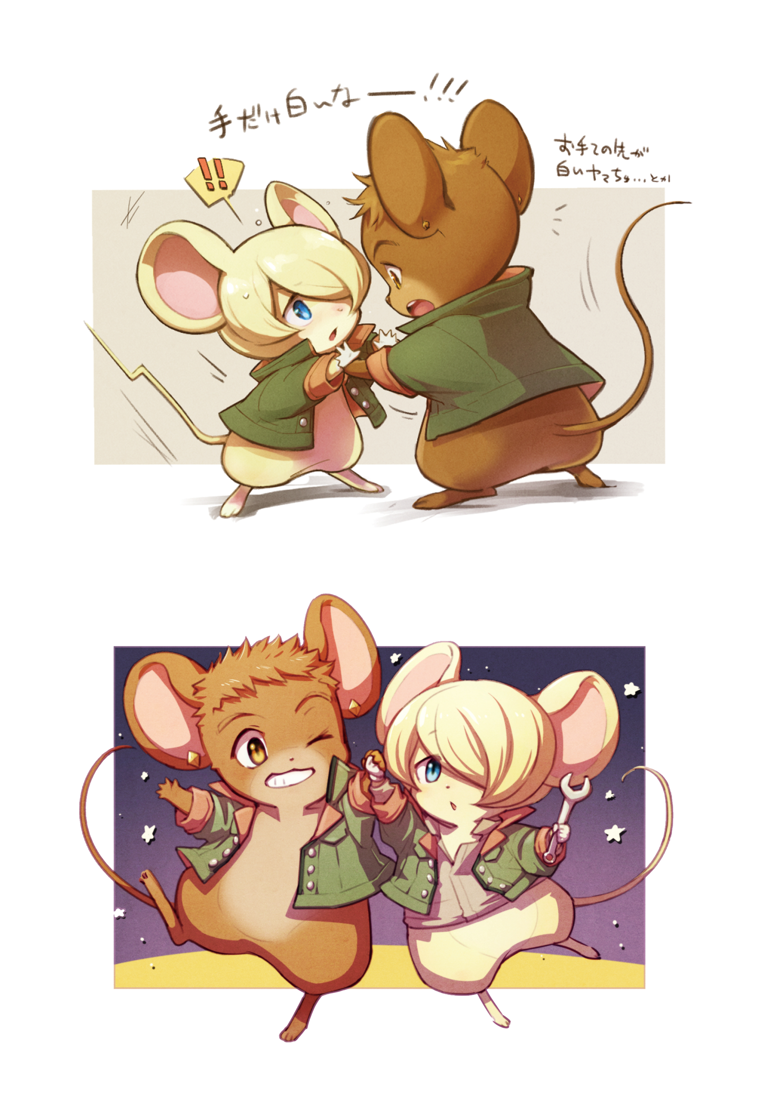 absurdres animal animalization blue_eyes clothed_animal commentary_request earrings green_jacket grin gundam gundam_tekketsu_no_orphans hair_over_one_eye highres holding_hands jacket jewelry looking_at_another mecyo_(mamezurushiki) mouse_(animal) no_humans norba_shino one_eye_closed smile translation_request wrench yamagi_gilmerton