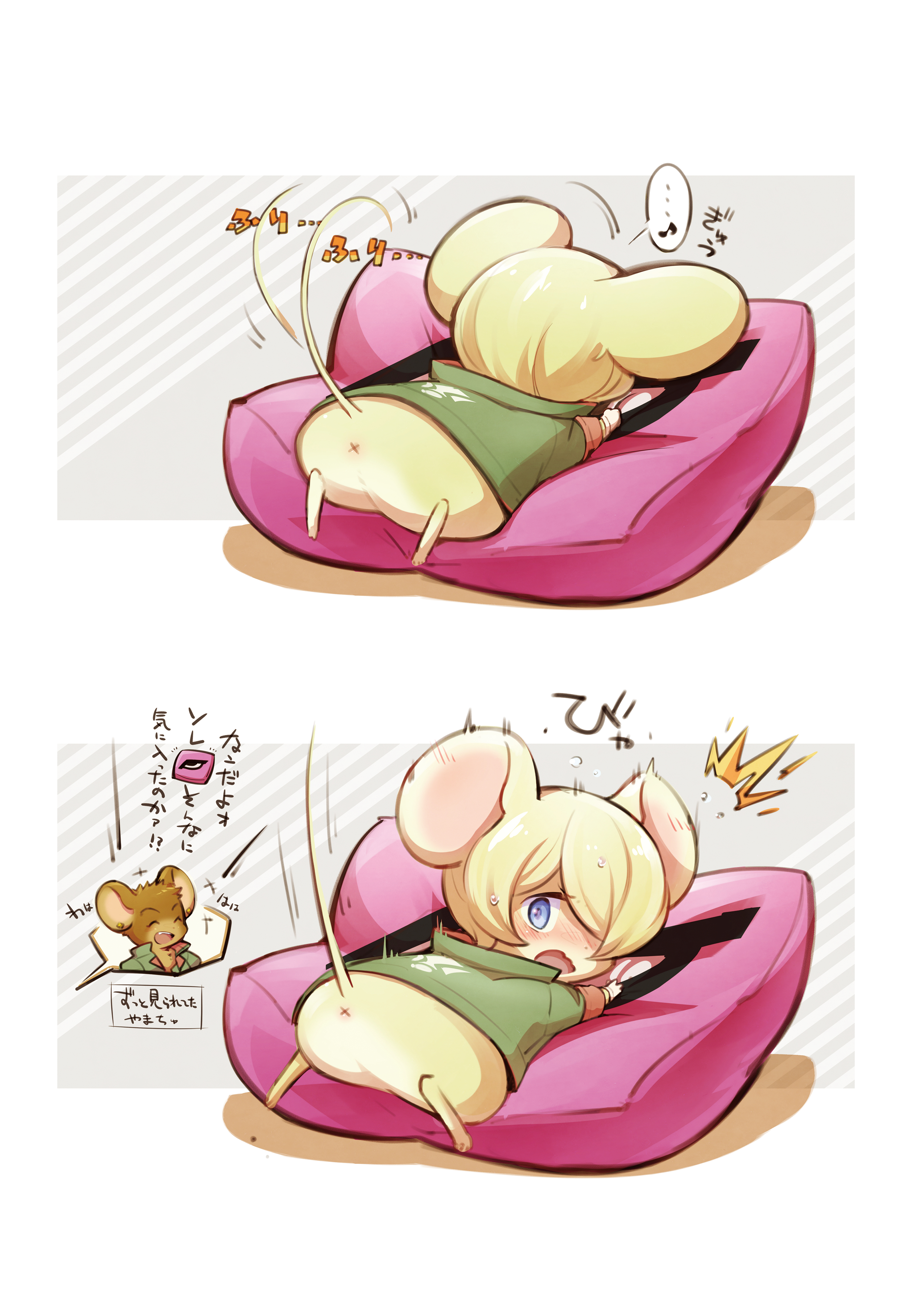... absurdres animal animalization blonde_hair blue_eyes clothed_animal commentary_request green_jacket gundam gundam_tekketsu_no_orphans highres jacket mecyo_(mamezurushiki) mouse_(animal) no_humans norba_shino open_mouth pillow speech_bubble spoken_character surprised translation_request x_anus yamagi_gilmerton