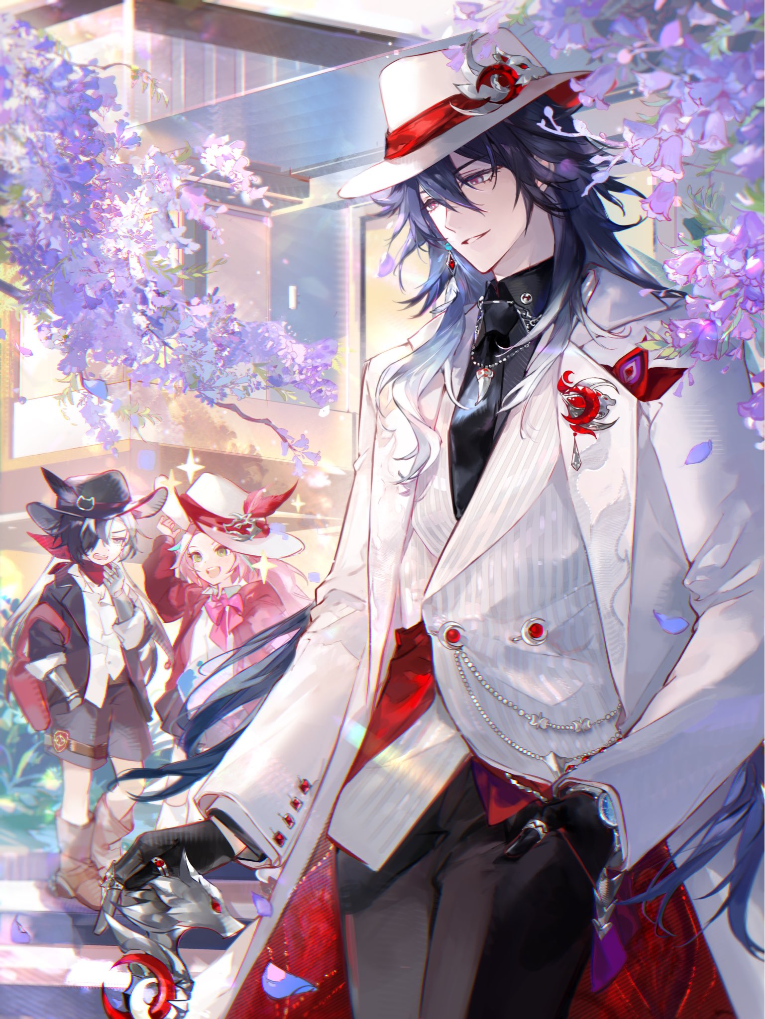&{ID:13735891 CreatedAt:Fri Mar 27 03:30:21 -0500 2026 Score:2 Width:1537 Height:2048 MD5:44af5875a9609b506a9878a4a6ceb42e Directory:44/af Image:44af5875a9609b506a9878a4a6ceb42e.jpg Rating:general Source:https://x.com/sannmenn/status/2036762235926900947 Change:1774600222 Owner:danbooru CreatorID:6498 ParentID:0 Sample:1 PreviewHeight:350 PreviewWidth:262 Tags:1girl 2boys aged_down alternate_costume ashveil_(honkai:_star_rail) black_hair boothill_(honkai:_star_rail) bow buttons chain collared_shirt commentary_request earrings flower formal_clothes gloves hair_between_eyes hand_on_cane hat hat_ornament highres honkai:_star_rail honkai_(series) jacket jewelry lapel_pin long_hair male_focus multicolored_hair multiple_boys necklace necktie open_clothes open_jacket outdoors pink_hair purple_flower rappa_(honkai:_star_rail) sanmen shirt shoes shorts single_earring streaked_hair suit tooth_necklace very_long_hair vest waistcoat watch wristwatch Title: HasNotes:false HasComments:false FileURL:https://img2.gelbooru.com/images/44/af/44af5875a9609b506a9878a4a6ceb42e.jpg PreviewURL:https://gelbooru.com/thumbnails/44/af/thumbnail_44af5875a9609b506a9878a4a6ceb42e.jpg SampleURL:https://img2.gelbooru.com/samples/44/af/sample_44af5875a9609b506a9878a4a6ceb42e.jpg SampleHeight:1133 SampleWidth:850 Status:active PostLocked:0 HasChildren:false IsVideo:false DisplayDate:27.03.2026 03:30}