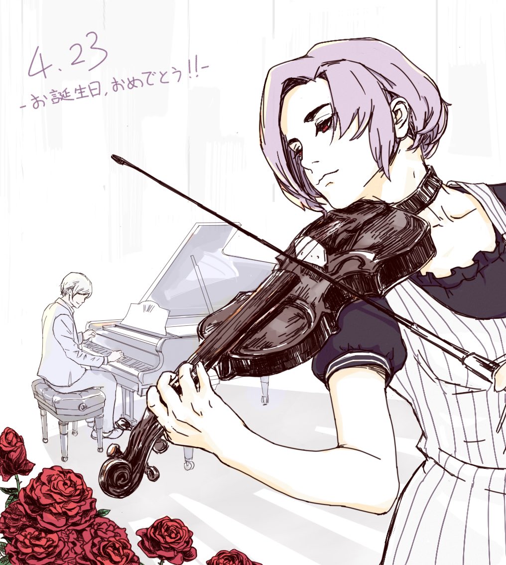 birthday closed_mouth commentary_request flower happy_birthday hoshino instrument kanae_von_rosewald parted_bangs piano red_eyes red_flower red_rose rose short_hair tokyo_ghoul tokyo_ghoul:re violin