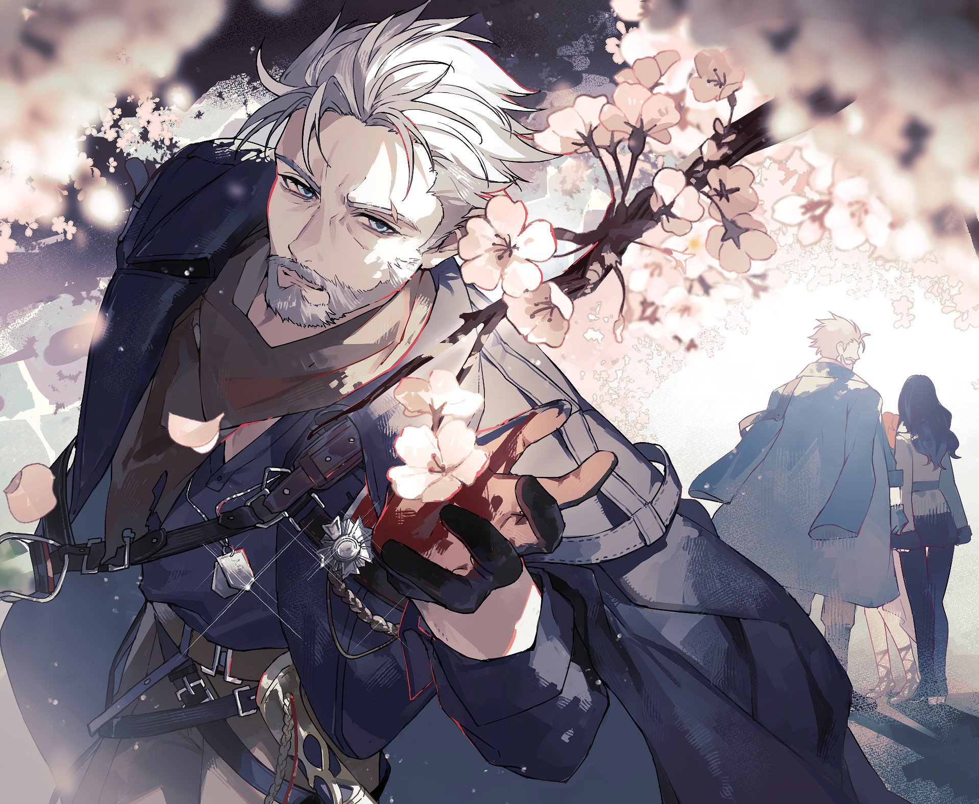1boy 2girls beard belt black_belt black_gloves black_hair black_jacket black_pants black_shirt black_shoes branch brown_pants brown_scarf cherry_blossoms coat coat_on_shoulders commentary_request dog_tags facial_hair flower gloves grey_eyes hand_up highres igor_(reverse:1999) jacket long_hair looking_at_viewer lopera_(reverse:1999) male_focus mature_male medal moldir_(reverse:1999) multicolored_gloves multiple_girls multiple_views old old_man open_clothes open_coat open_jacket pants red_gloves red_hair reverse:1999 scarf shirt shoes short_hair solo_focus syerii two-tone_gloves white_flower white_hair white_jacket