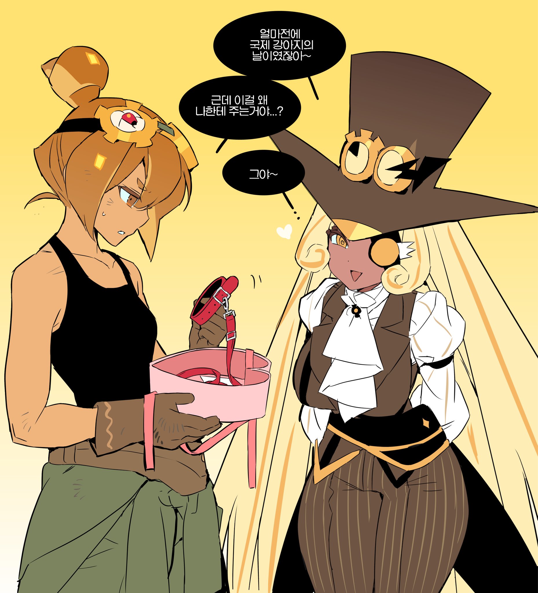 2girls :d arms_behind_back arrow_(symbol) ascot bare_arms bare_shoulders black_tank_top blonde_hair box breasts brown_eyes brown_gloves brown_hair brown_hat brown_pants brown_vest clothes_around_waist collar collarbone colored_eyelashes commentary_request cookie_run cookie_run:_ovenbreak cowboy_shot croissant_cookie curly_sidelocks dark-skinned_female dark_skin dot_nose dual_persona eyepatch food-themed_hair from_side gloves goggles goggles_on_head goggles_on_headwear green_jacket hair_between_eyes hair_bun hat heart heart-shaped_box highres holding holding_box holding_collar humanization implied_selfcest implied_yuri jacket jacket_around_waist juliet_sleeves korean_commentary korean_text lapels large_breasts large_hat leaning_forward leash long_hair long_sleeves looking_at_another looking_at_object looking_down multicolored_hair multiple_girls notched_lapels ohta_guk_hip one_eye_covered open_mouth orange_hair orange_streaks pants parted_lips pinstripe_pants pinstripe_pattern profile puffy_sleeves red_collar shirt short_hair sidelocks sideways_mouth simple_background single_hair_bun small_breasts smile speech_bubble standing straight_hair streaked_hair sweatdrop tank_top tareme thick_thighs thighs timekeeper_cookie tinted_eyewear tongue top_hat translation_request triangle_mouth tsurime unworn_collar v-shaped_eyebrows vertical-striped_sleeves very_long_hair vest white_ascot white_shirt yellow-framed_eyewear yellow-tinted_eyewear yellow_background yellow_eyes
