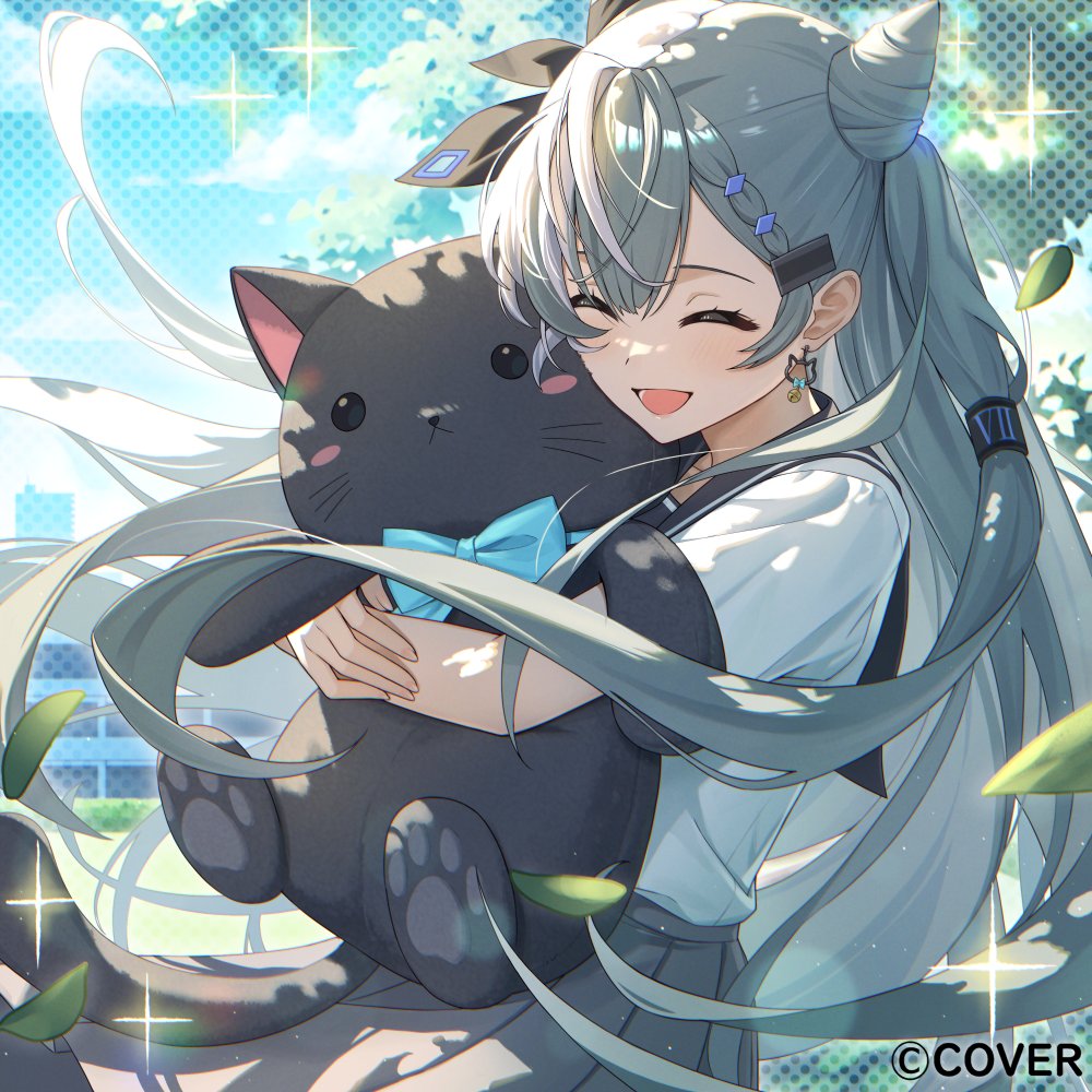 1girl ^_^ album_cover black_ribbon black_sailor_collar braid braided_bangs closed_eyes commentary cone_hair_bun copyright_notice cover day double_bun earrings english_commentary falling_leaves grey_hair grey_skirt hair_bun hair_ornament hair_ribbon hairclip holding holding_stuffed_toy hololive hololive_indonesia jewelry leaf long_hair miniskirt official_art one_side_up open_mouth outdoors pleated_skirt ribbon sailor_collar school_uniform serafuku shirt shirt_tucked_in short_sleeves skirt smile solo stuffed_animal stuffed_toy tokisaka_makoto very_long_hair vestia_zeta virtual_youtuber white_shirt