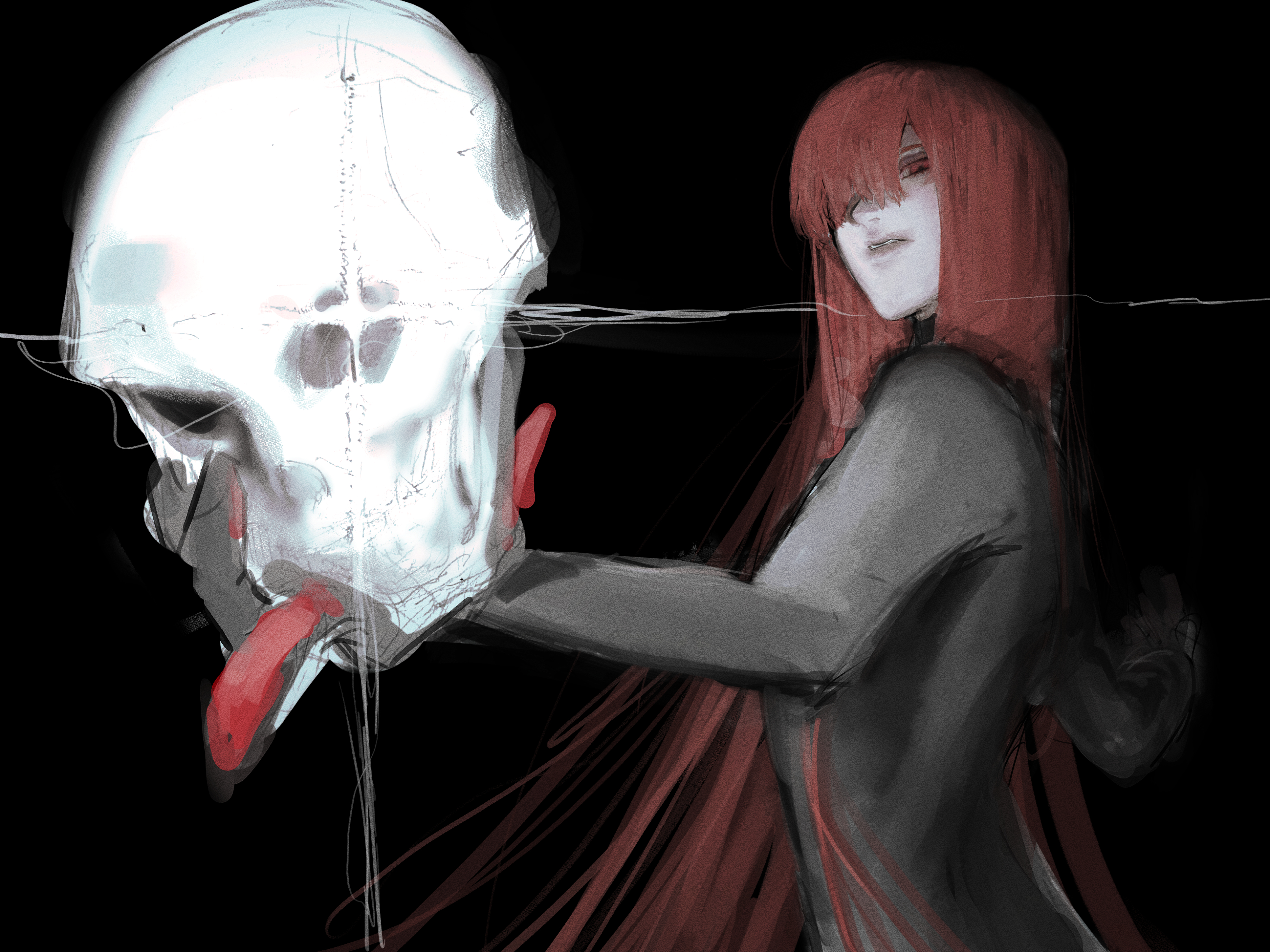 1girl absurdres black_background bodysuit commentary_request fate/grand_order fate_(series) hair_over_one_eye highres holding holding_skull kota_soydog long_hair oda_nobunaga_(fate) oda_nobunaga_(maou_avenger)_(fate) red_eyes red_hair skull solo upper_body