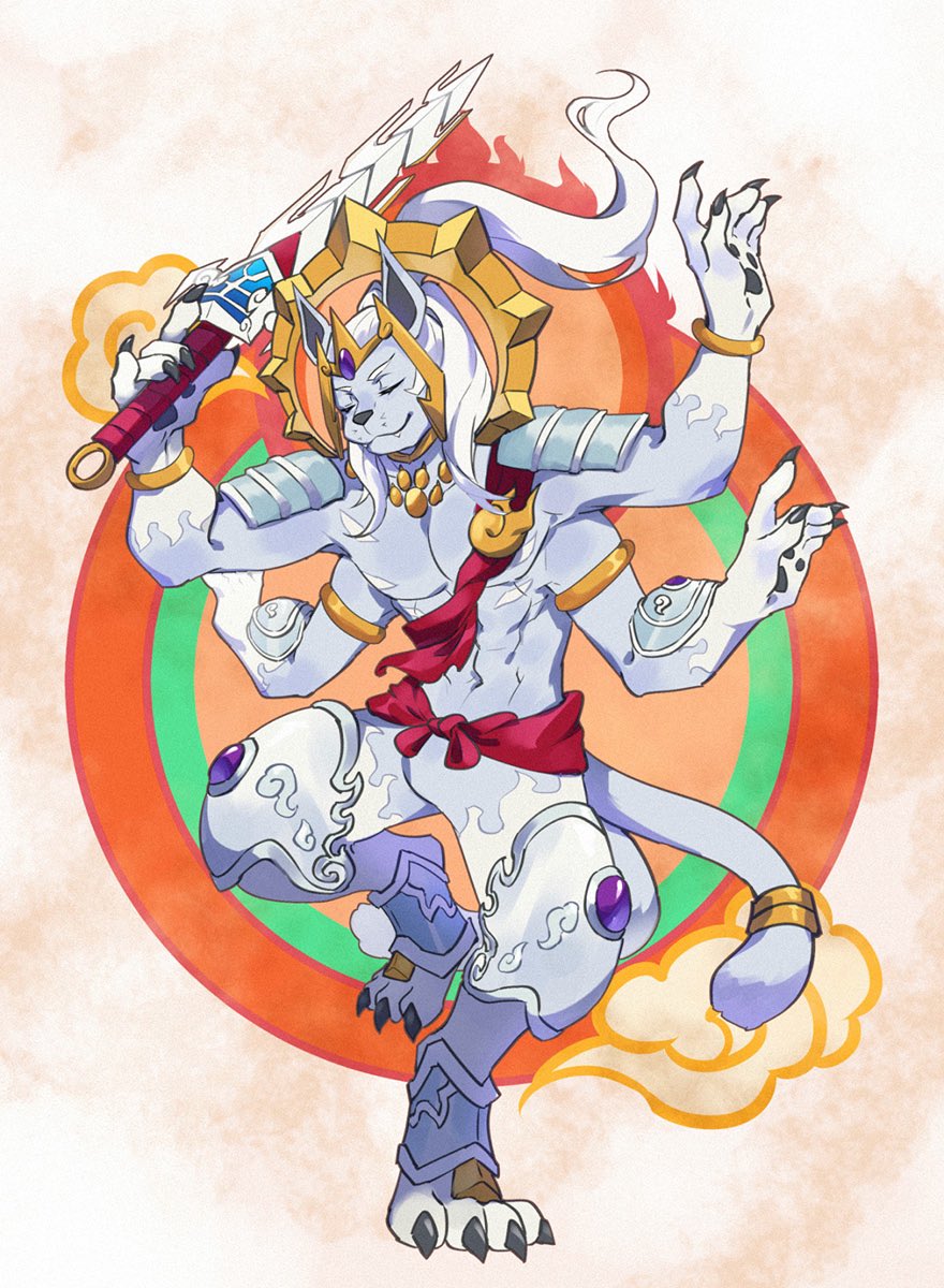armlet bracelet claws closed_eyes cloud commentary_request digimon digimon_(creature) extra_arms furry gold_armlet habakirimon headpiece highres holding holding_sword holding_weapon jewelry knee_pads lws4cydxt pawpads shoulder_pads sword tail weapon white_hair xiangyun