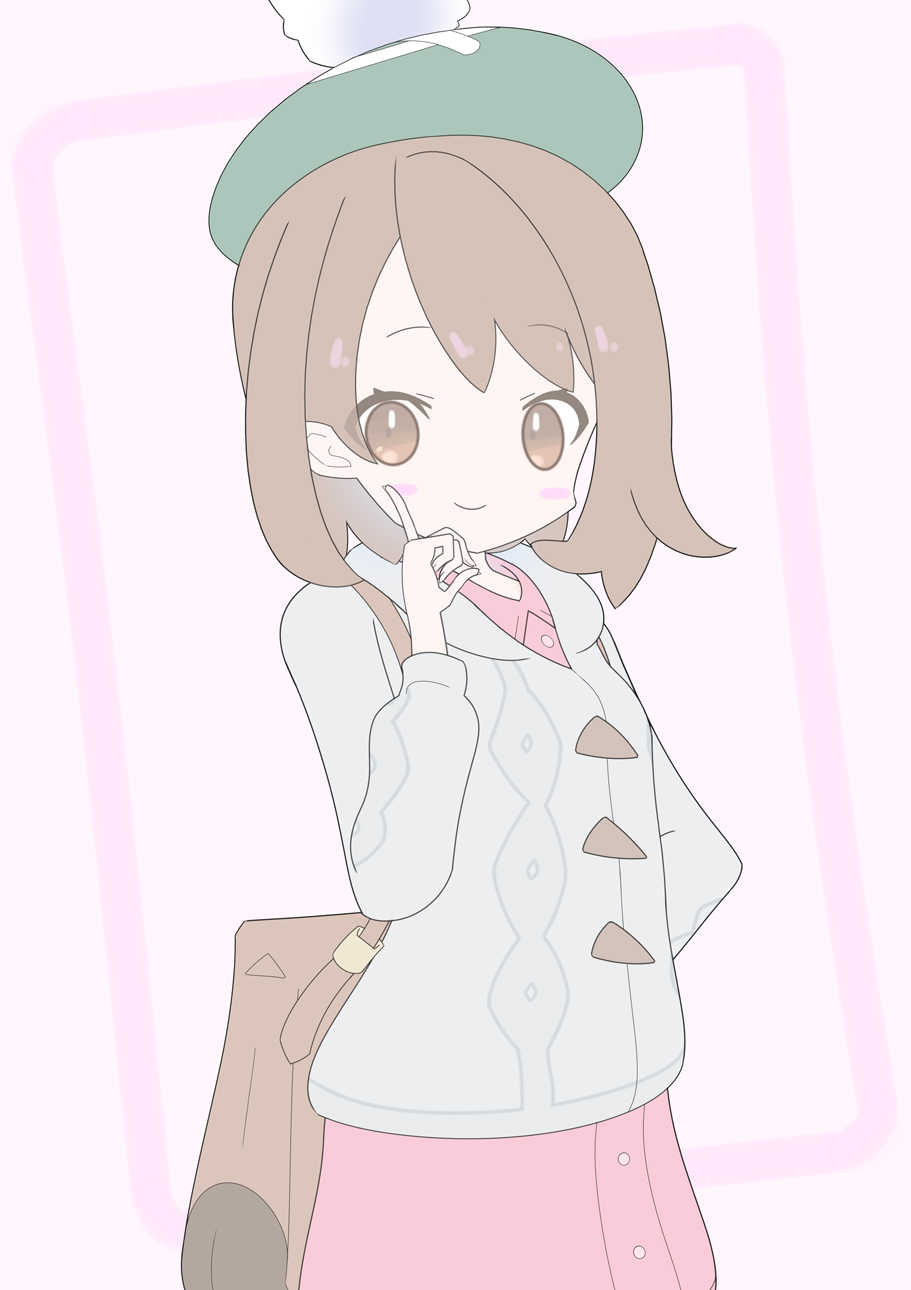1girl backpack bag blush_stickers border brown_bag brown_eyes brown_hair buttons cable_knit cardigan collared_dress commentary_request dress gloria_(pokemon) green_hat grey_cardigan hat highres hood hooded_cardigan long_sleeves nintendo outside_border pink_background pink_dress pokemon pokemon_sword_and_shield shisa-tsukishima smile solo tam_o'_shanter white_border