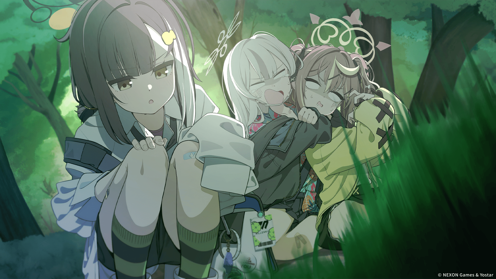 3girls bandaid bandaid_on_knee bandaid_on_leg blank_eyes blonde_hair blue_archive blunt_bangs blurry blurry_foreground brown_hair brown_halo dutch_angle forest grass green_socks grey_halo grey_jacket hair_ribbon halo hawaiian_shirt highres hug jacket konoka_(blue_archive) long_hair long_sleeves miniskirt multicolored_hair multicolored_halo multiple_girls nature official_art open_mouth parted_bangs rena_(blue_archive) ribbon scared shaded_face shirt shiwa_(siwaa0419) skirt sleeves_past_fingers sleeves_past_wrists socks squatting streaked_hair striped_clothes striped_socks tears tree tsubasa_(blue_archive) twintails white_hair white_shirt yellow_eyes yellow_halo yellow_jacket