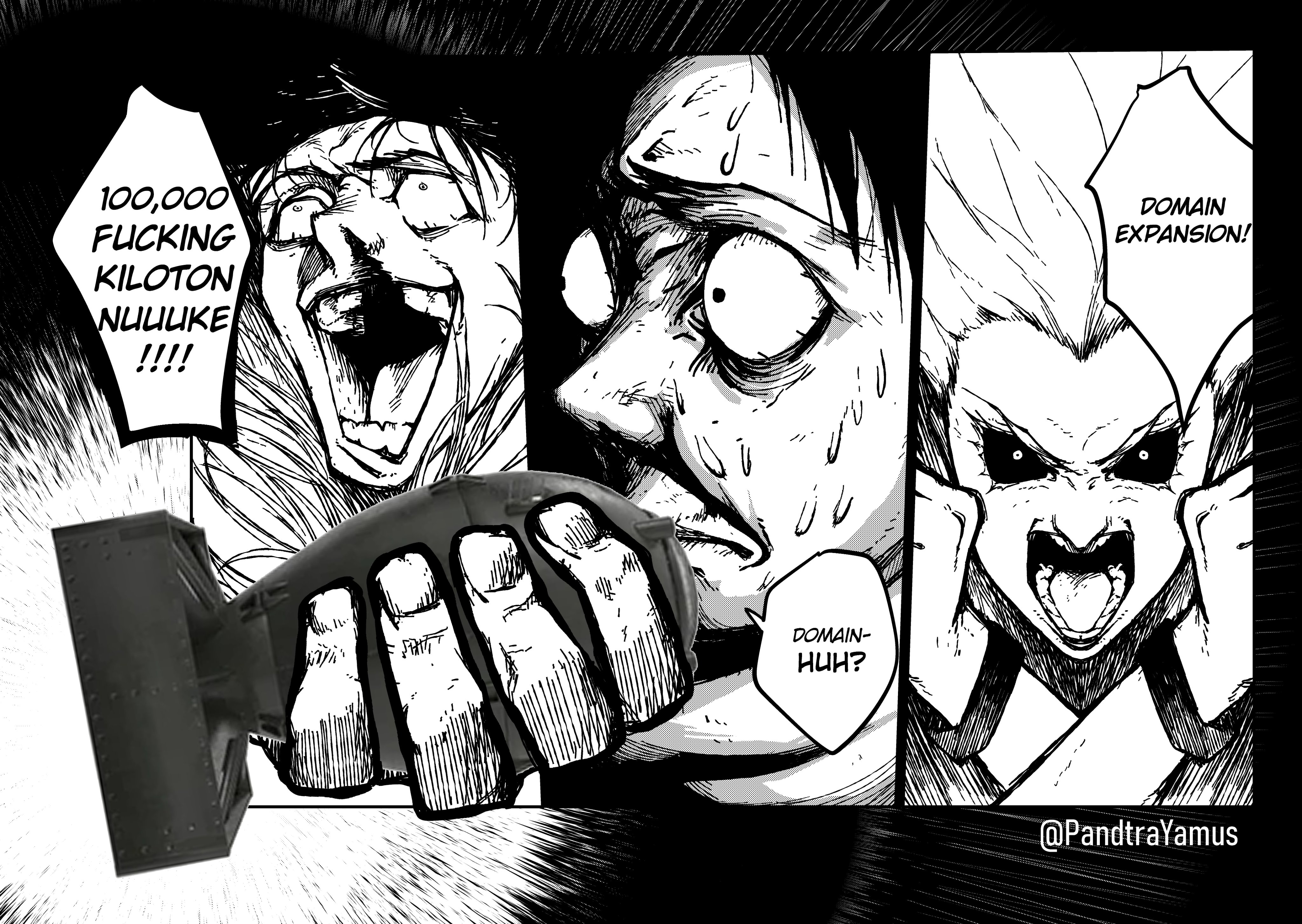 2boys absurdres black_sclera blood bomb colored_sclera commentary crazy_smile domain_expansion english_commentary explosive highres holding holding_bomb ishigori_ryu jujutsu_kaisen multiple_boys nosebleed nuclear_weapon okkotsu_yuta pandtrayamus scared scene_reference smile sweat twitter_username uro_takako
