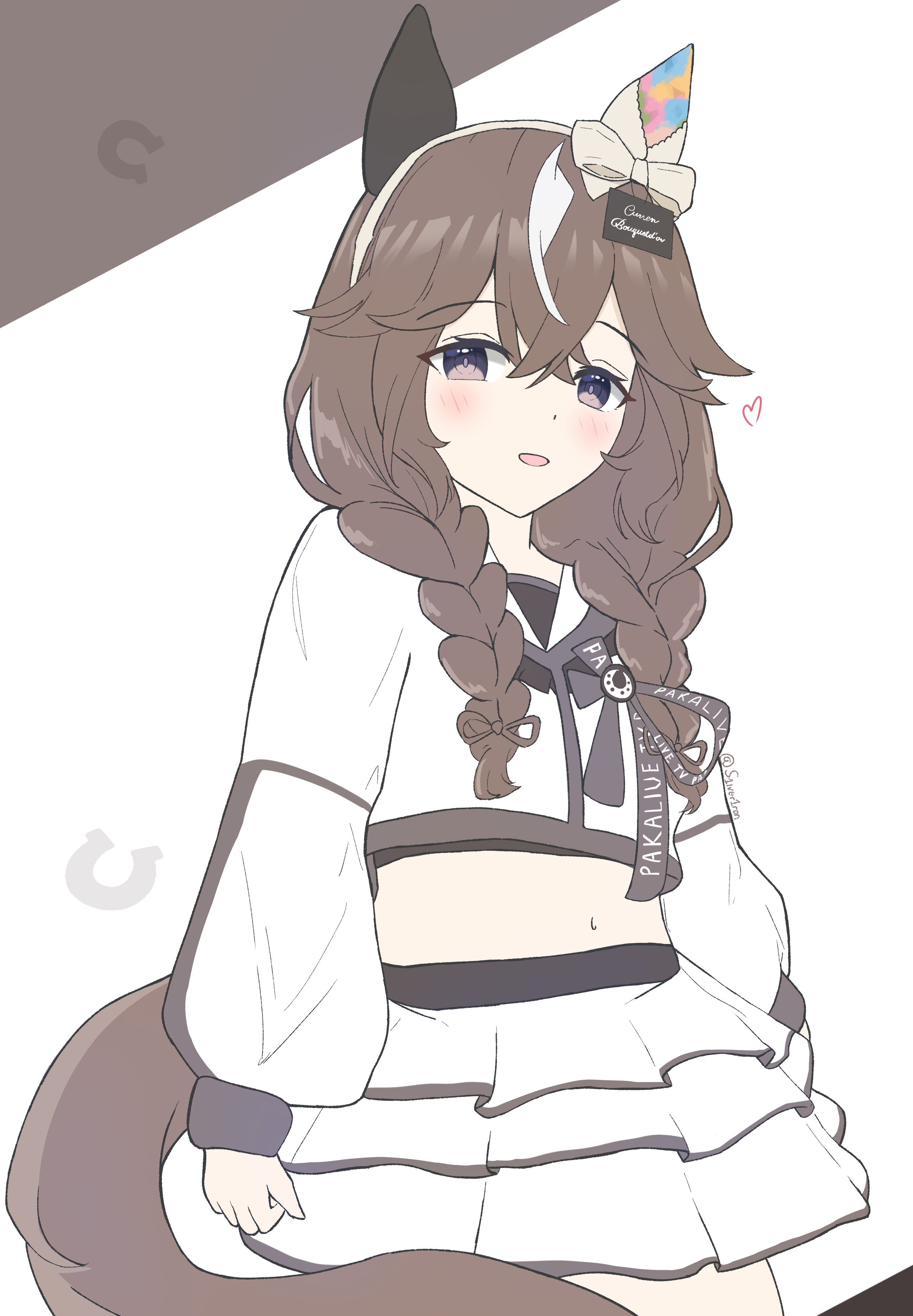1girl absurdres alternate_costume animal_ears auxuelus blush braid breasts brown_hair commentary_request curren_bouquetd'or_(umamusume) hair_ornament hairband highres horse_ears horse_girl horse_tail jacket long_hair low_twin_braids midriff navel open_mouth small_breasts solo tail twin_braids umamusume